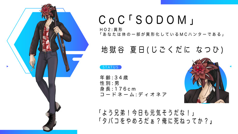 utsm_sta☆quiet followINFO #空蝉の探索者名簿CoC「SODOM」HO2:異形 「あなたは体の一部が異形化しているMCハンターである」地獄谷 夏日(じごくだに なつひ)性別:男年齢:34身長:176cm今週末!顔が咲いた異形でいくぜ!!よろしくお願いします!!! ##ディスプレイ Tap to full screen (size:1920x1080).Repost is prohibited Let's send reactions! freqpopularsnackothersPayment processing Replies from the creator Follow creator you care about!☆quiet follow utsm_staINFOCoC「えっ?手のひらから唐揚げ出せるんですか?」作者&KP*りくも様PC/PL片平 和泉/えーちゃん鈴宮 リン/空蝉両生還にてシナリオクリア!ありがとうございました!!笑いすぎてお腹痛い utsm_staINFOCoC「アンダーテリング」作者*ぶんどき様KP*のらいぬさんPC/PL渡会 紅/空蝉砌 弥彦/Lyuさん両生還でシナリオクリアでした!!ありがとうございました!!!!! utsm_staINFOCoC「太陽と月と眼」作者*春野おかず様KP*杏狐さんKPC*ロイ・デズモンドPC/PLカメリア・アイレクス/空蝉置き卓でアメリカ人達の邂逅をしました!!ネグレクトのロイくんと被虐待児のカメリア。仲良くなれたらいいね。 utsm_staINFOCoC「麒麟の足」作者*おさしみ大帝国様KP*まるさんPC/PL神崎 風磨/空蝉神倉 雷牙/のらいぬさんエンドAで両生還です!!最終タイムは神崎483.4s神倉489.7sでした!勝った~~~~~~~~~!!!!!!!! utsm_staINFOCoC「SHOTGUN KIXXING MARRIAGE」作者*左に右折 様KP*夜飼ヨルさんPC/PLルーカス・カーター/まるさんエリィー・ペリステリス/空蝉エンドCにて両生還!!楽しかった~~~!!!!!! 2 utsm_staINFOCoC「ドリフト・ホワイト」作者*錫木屋 様KP*空蝉KPC*八咫PC/PL因幡 素/杏狐さんエンド①にて両生還!置き卓エロシありがとうございました!!!!!セッしました!!!!!!!!!!!!!!!!!!!!!!!!!!!!!!! related works ちゃづDONE描いたやつその1※茨あん、ジュンあん 17 べこDOODLEピンク色のバレンタインなヨウグズ🍫 ココノカSPOILER幻覚なので全くネタバレではないけど1072話の発言ネタ きくちゃんDOODLEサタン様犬好きかと思いきやロクサーンみたいなパターンもあるのでやっぱ人外思考なのかな~ わたさくDOODLE きくちゃんDOODLEサタン様犬好きかと思いきやロクサーンみたいなパターンもあるのでやっぱ人外思考なのかな~ ちゃづDONE描いたやつその1※茨あん、ジュンあん 17 2watoyoDOODLE【朝のボールペン落書き】【日楠♀】【先天性女体化】日高先輩×男装後輩サキュバス家系楠ちゃん。海編。本当に気にしてるのは。 nnnnnnoodderaDONE【腐向け】チャバが酔ってハ崎さんに甘えてる漫画。ハ崎さんがトイレに行くのを我慢していたりする。 4 recommended works kimikohouseDOODLE按護さまのフェ…顔が見たいすけべ絵 utsm_staINFO #空蝉の探索者名簿 CoC「DOGMA」HO1:正義の復讐者名前:八咫(やた)来週からDOGMA!初めての暗黒の祖先PCですやったー!へらへら最悪お兄さんで行くぞ!よろしくお願いします!! 2 utsm_staINFO #空蝉の探索者名簿CoC「真夜中は恋人」名前:百合谷 騎星(もまえだに きら)金曜夜からまよこい!KPCの騎星は愛兎。(らびっと)名義でガチ恋配信者をしてるapp17!よろしくお願いします!! utsm_staINFO #空蝉の探索者名簿CoC「デッドエンド・キラーサイト」HO:殺人鬼名前:華蓑 笠子(はなみの かさこ)明日からデッキラ!楽しみ!!恋する殺人鬼笠子ちゃんと言ってきます!新しい恋と会えるといいな🎶 utsm_staINFO #空蝉の探索者名簿CoC「君を土に埋める日」名前:グリップ阪本(本名:阪田 本次郎)売れないピン芸人がゆく君埋めは明日から!よろしくお願いします!! ピ◯ミン好きPROGRESSピクシブに投稿している悠脹漫画の最終話予告です!良いところで出てくる宿儺wポイピクを始めたので、試しに投稿してみました。これからXに上げられないR指定の作品は、こちらに投稿していきます。 まみやDOODLE ツイリ☂️🐡DONE📿💎の理i非i知iらずです。できました🙌18↑ y/n? かおりDOODLEオルペン シャエロ絵 リクエスト