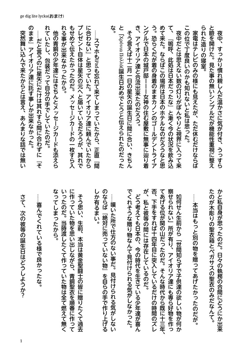 ChidoriKure☆quiet followDONEロス受けthemesさん お題「プレゼント🎁」で書かせて頂きました小説の続き(おまけ)になります。幼教皇ロス兄さん視点になります。CPはシュラロスです。お仕事が終わって半ば無理矢理(薄着)で日本へとやって来たカノンとロス兄さんの服を一式買い物したり、聖域まで帰ってからのサガ兄さんとの話だったり色々詰め込んでみました☺ show all(+13 images) Tap to full screen (size:1266x1797).Repost is prohibited Let's send reactions! freqpopularsnackothersPayment processing Replies from the creator Follow creator you care about!☆quiet follow ChidoriKureDONEロス受けthemesさん お題『ミルク(絵文字が無かったのでそのままです😓💦)』すっかり遅くなりましたor色々と迷走するだけ迷走した結果、「これ以上は無理」と言う事で散々迷っていた毒花兄さんのとある一つの結末を書かせて頂きました。CPは♊♑♌⇨⇨⇨⇦♐です。回想でさっくりですがR18です。三人に溺愛されているロス兄さんが苦手な方はお気を付け下さいね😅💦 6 ChidoriKureDONE4日程遅れてしまいましたが、3月10日はアフロディーテの誕生日!と言う訳で、アフロディーテと幼教皇ロス兄さんの【♓♐時空の結末含みなお誕生日おめでとう】小説になります!(∩´∀`∩)ずっと結末は同じ展開にしようかと思って大体の構想を練っていましたが、選んだ相手によって分かる事と分からない事も違えば、未来も変わって来るよなあ…と思い直しまして、二人はこんな感じになってしまいましたσ(^_^; 14 ChidoriKureDONEロス受けthemesさん お題『アレルギー』通常蘇り設定のロス兄さんです。前回、前々回の「毒花」だと言われて困惑or少しノイローゼ気味なロス兄さんの話の続きになります(これだけでも読める様に書いたつもりですが、分かり難い場合は申し訳御座いません…!)♊♑♌→♐です。前半はアフロディーテ、後半は女神視点になります。 16 ChidoriKureDONEロス受けthemesさん お題『バレンタインデー🍫』前回お題『毒』にて書かせて頂いていた通常蘇り設定ロス兄さん(続き)になります。CPは有りませんが、♊(兄)♑♌⇨♐になっています。視点はミロ君です。無意識に男三人を翻弄させてしまっている見た目は大人な十四歳なロス兄さん…って改めて書いても色々やばいなと思いました😅💦青銅達にも懐かれてるロス兄さんが大好きです! 8 ChidoriKureDONE2月7日はカミュ君の誕生日!3日程遅れてしまいましたが「誕生日おめでとう」短文になります(∩´∀`∩)何気にシュラ君の誕生日も(推しなのに!)現在進行形で遅れておりまして、其れが悔しいからとぺら本作ろうと原稿してますので、其処にカミュ君まで増やす訳には…とどうにか仕上げてみました☺💕週末の息抜きにでも楽しんで頂ければ幸いです! 5 ChidoriKureDONEロス受けthemesさん お題『毒』通常蘇り設定のロス兄さん視点の短文です。シュラ→ロスですが、サガ兄さんとリア君にも同じ様に想われているけれど、本人は良く分からないから少し困っているかも…な話です。軽く馬乗りになって『ちゅー』している程度の、個人的にはR15かな?と思っているので、ワンクッションも付けていません😅💦 7 recommended works こよみTRAININGこよみんちの獠香で「硝煙」と「パーティー」のお話はどうでしょう? 9ツイート(1260字)程度だと嬉しいですっ!#CHしたったー #shindanmakerhttps://t.co/pVfxz10Cptかほるさんのご提案で作った診断メーカー。書きましたよ!珍しくこの量を2時間くらいで書きました。恋人関係の獠香です♥楽しんでいただければ幸いです。 3 かほる(輝海)DONEシティーハンター冴羽獠×槇村香原作以上の関係書き手募集していたのでびんじょった(*´ω`*)Rさま(@ryu_wen)ありがとうございました!Rんちの冴羽くんと香で「唇」と「「ばぁか」」のお話はどうでしょう? 1ツイート(140字)程度だと嬉しいですっ!#CHしたったー #shindanmakerhttps://t.co/2IQJRYQwf0 かほる(輝海)DONEシティーハンター冴羽獠×槇村香原作以上の関係かほるさんちの獠と香で「光」と「呼ぶ」のお話はどうでしょう? 1ツイート(140字)程度だと嬉しいですっ!#CHしたったー #shindanmakerhttps://t.co/Iii6WviiIDまずは朝チュンから(*´艸`*) mu_ra_btDOODLEうさぎの肉球が毛深いと聞いて触って確かめたくて仕方ない月咲桂花#なんとなく可愛い #shindanmaker aosabikinakoTRAINING貴方はアオ相で『お気に召すまま』をお題にして140文字SSを書いてください。#shindanmakerhttps://shindanmaker.com/375517アオ相ちゃん、ごっこ遊びしてたら可愛い。 aosabikinakoTRAINING貴方はハル相で『うん、知ってる』をお題にして140文字SSを書いてください。#shindanmakerhttps://shindanmaker.com/375517 ちゃとらDOODLEちゃとらさんが引いたのは【茶髪】【盲目】【十代後半】【アタッシェケース】【腕時計】【剣】【怒りっぽい】です!どんな子が出来るかな?#shindanmakerhttps://shindanmaker.com/1038993腕時計は袖で隠れてしまったけどキーアイテム設定がある… ucha_rkrnPAST利こまと神社不破の落書き 2 やさし茶REHABILI