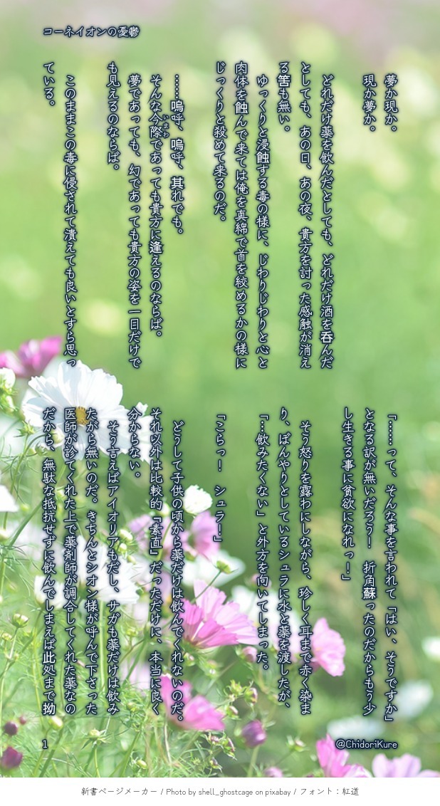 ChidoriKure☆quiet followDONEロス受けthemesさん お題『毒』通常蘇り設定のロス兄さん視点の短文です。シュラ→ロスですが、サガ兄さんとリア君にも同じ様に想われているけれど、本人は良く分からないから少し困っているかも…な話です。軽く馬乗りになって『ちゅー』している程度の、個人的にはR15かな?と思っているので、ワンクッションも付けていません😅💦 show all(+6 images) Tap to full screen (size:618x1132).Repost is prohibited Let's send reactions! freqpopularsnackothersPayment processing Replies from the creator Follow creator you care about!☆quiet follow ChidoriKureDONEロス受けthemesさん お題『ミルク(絵文字が無かったのでそのままです😓💦)』すっかり遅くなりましたor色々と迷走するだけ迷走した結果、「これ以上は無理」と言う事で散々迷っていた毒花兄さんのとある一つの結末を書かせて頂きました。CPは♊♑♌⇨⇨⇨⇦♐です。回想でさっくりですがR18です。三人に溺愛されているロス兄さんが苦手な方はお気を付け下さいね😅💦 6 ChidoriKureDONE4日程遅れてしまいましたが、3月10日はアフロディーテの誕生日!と言う訳で、アフロディーテと幼教皇ロス兄さんの【♓♐時空の結末含みなお誕生日おめでとう】小説になります!(∩´∀`∩)ずっと結末は同じ展開にしようかと思って大体の構想を練っていましたが、選んだ相手によって分かる事と分からない事も違えば、未来も変わって来るよなあ…と思い直しまして、二人はこんな感じになってしまいましたσ(^_^; 14 ChidoriKureDONEロス受けthemesさん お題『アレルギー』通常蘇り設定のロス兄さんです。前回、前々回の「毒花」だと言われて困惑or少しノイローゼ気味なロス兄さんの話の続きになります(これだけでも読める様に書いたつもりですが、分かり難い場合は申し訳御座いません…!)♊♑♌→♐です。前半はアフロディーテ、後半は女神視点になります。 16 ChidoriKureDONEロス受けthemesさん お題『バレンタインデー🍫』前回お題『毒』にて書かせて頂いていた通常蘇り設定ロス兄さん(続き)になります。CPは有りませんが、♊(兄)♑♌⇨♐になっています。視点はミロ君です。無意識に男三人を翻弄させてしまっている見た目は大人な十四歳なロス兄さん…って改めて書いても色々やばいなと思いました😅💦青銅達にも懐かれてるロス兄さんが大好きです! 8 ChidoriKureDONE2月7日はカミュ君の誕生日!3日程遅れてしまいましたが「誕生日おめでとう」短文になります(∩´∀`∩)何気にシュラ君の誕生日も(推しなのに!)現在進行形で遅れておりまして、其れが悔しいからとぺら本作ろうと原稿してますので、其処にカミュ君まで増やす訳には…とどうにか仕上げてみました☺💕週末の息抜きにでも楽しんで頂ければ幸いです! 5 ChidoriKureDONEロス受けthemesさん お題『毒』通常蘇り設定のロス兄さん視点の短文です。シュラ→ロスですが、サガ兄さんとリア君にも同じ様に想われているけれど、本人は良く分からないから少し困っているかも…な話です。軽く馬乗りになって『ちゅー』している程度の、個人的にはR15かな?と思っているので、ワンクッションも付けていません😅💦 7 recommended works リアクションありがとう~~CAN’T MAKEあなたは今日のっばての「まだ望みあるって思ってていい?」という台詞を使った1コマ漫画を描きます。#この台詞を使って1コマ漫画 #shindanmakerhttps://shindanmaker.com/524501 つぁんDOODLEパンチする真似をしたら、むすっとさせてうつむく東窪#ちょっかい出してみた #shindanmakerhttps://shindanmaker.com/900379 SasameDONEあなたは5RTされたら「ね…身体が、熱いの…」の台詞を使って細雪を描(書)きましょう。#shindanmakerhttps://t.co/iyLUWeoRDQ恋人未満の二人😆😆😆 こよみTRAININGあなたはこよみさんちの獠香で【余裕なんてない / あなたの耳にくちづけを】をお題にして140字SSを書いてください。#shindanmakerhttps://shindanmaker.com/780366藍馨さまから優先リクをいただき、書きました。ちょいエロシチュのワードなのに、エロくなりません。何故だろう。耳にキスは「誘惑」、らしいです。頑張れ、香ちゃん❤️ かほる(輝海)DONEシティーハンター冴羽獠×槇村香原作以上の関係かほるさんちの獠と香で「光」と「呼ぶ」のお話はどうでしょう? 1ツイート(140字)程度だと嬉しいですっ!#CHしたったー #shindanmakerhttps://t.co/Iii6WviiIDまずは朝チュンから(*´艸`*) ムゥチャDOODLEあなたはベルスミの「何を言おうと言い訳になるだけだから」という台詞を使った1コマ漫画を描きます。#この台詞を使って1コマ漫画 #shindanmakerhttps://shindanmaker.com/524501 aosabikinakoTRAINING※門司くん独白※貴方は門司くんで『最後の言葉』をお題にして140文字SSを書いてください。#shindanmakerhttps://shindanmaker.com/375517 haribuchi_trpgDOODLE #この台詞から妄想するなら2 #shindanmakerhttps://shindanmaker.com/705660?c=1を自探で回して遊んでたアナログざつがき 4 もくまおう@mokuma_ohDONE貴方は巌ふち@もくまおうで『幸福な朝』をお題にして140文字SSを書いてください。※現パロ巌ふち💚💛※同棲設定※付知視点ポエ