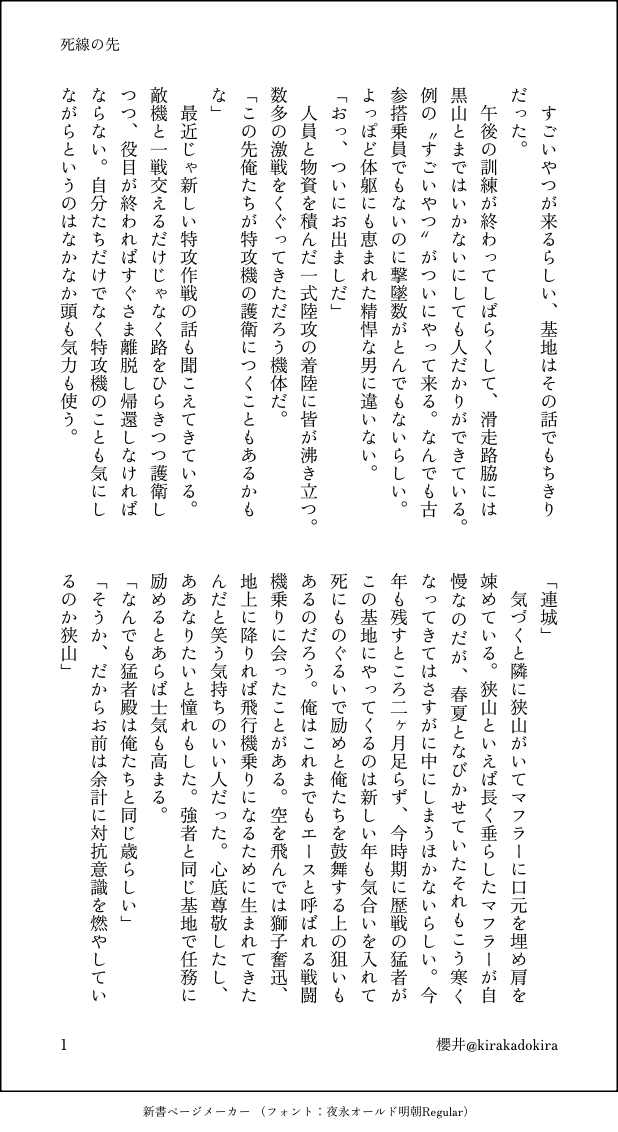 さくらい☆quiet followDONE蛍🔥/🟣⚡️/SS『死線の先』以前幼なじみ設定の三人を書いたので今度は最近出会った設定で書いてみました。鹿児島へ行く前のお話。連城目線です。(画像7枚) #蛍火艶夜 show all(+6 images) Tap to full screen (size:618x1132).Repost is prohibited さくらいPAST蛍🔥/塚橋既刊『群青抱きて』収録、戦後の淀野さんとたろちゃんのお話です。短いですが気に入ってます。 2015 さくらいPAST蛍🔥/塚橋既刊『群青抱きて』に載せた書き下ろしです。戦後if 6605 さくらいDONE蛍🔥/短歌ログ④※随時更新 さくらいDONE蛍🔥/🟣⚡️/SS『死線の先』以前幼なじみ設定の三人を書いたので今度は最近出会った設定で書いてみました。鹿児島へ行く前のお話。連城目線です。(画像7枚) 7 さくらいDONE蛍🔥/こいさや/現パロ以前書いたビールフェスに行く連泉と同軸で起こっているこいさやの話です。連泉を読まなくてもこのお話単体で読めます。 6813 さくらいDONE蛍🔥/連泉、現パロ。以前から書きたいと思っていたビールフェスに行く連泉です。こいさやの原稿が終わったので浮かれて書きました。私の浮かれ具合が伝わっていたら嬉しいです。なお、連城がキャラ崩壊気味というか心の声がやかましいです。お許しください。※モブの女の子が出てきます、こいさやの匂わせもあります。大丈夫な方のみよろしくお願いします。初めて書いた連泉なのでなまあたたかい目で見てやってください。 7873 related works かれ〜DOODLE🔞モブ×狭山キャラ崩壊? キャンキャン言わせたいだけ 側面BDOODLE下巻読んだ!伴君かわいい~~~~ 佐伯雛子DONE昨日フォロワーさんとのスペースが楽しくて、勢いでモブ視点wdtm坂伴書きました。勢いなので文面がおかしいところがあります。また書き直して支部に投稿し直します。 9255 pomDONEIF塚橋 2日目の夜塚橋が好きすぎて初めてR18絵に挑戦しました。2日目があったら絶対すごいらぶらぶえちだったと思う…😭Pass: 貴様は18歳以上か!?(yes/no) 2 佐伯雛子MEMO先輩オブ先輩モブ×必中君の〇〇責め妄想メモです。小説ではないけど、昇華させたかったので呟かせてください!!!!🔞→yes/no 1760 佐伯雛子DONEサカノーエさんと姪っ子がきゃっきゃしてるところが書きたかっただけの話です。捏造純度100パーのサカノーエさんの姪っ子が登場します。下記姪ちゃんの設定です。7月の本にもこの子は登場します。こんな感じの姪ちゃんとサカノーエさんの話をいつか本にしたいです。言うのはタダ。メイちゃん=庚二の兄の娘(ひとりっ子)私立幼稚園に通っている。ギフテッドな三歳児。コウちゃん(高3)が大好き。 5870 EO_2DOODLE和さん、恋に落ちる10秒前。タロチャンは、恋の感情にはまだ鈍ちん。キス魔だといいな〜 PW:18↑? y/n 3 佐伯雛子DONEなんの山もオチもない現パロ坂伴ssです。金曜日はカレーの日。 4521 おかずMOURNING塚橋描き手としてやっぱえっちな絵は通過儀礼として描かねばと思って…まずはお塩を少々…pass:18歳以上?(yes/no) recommended works rinkokonoeDOODLE塚橋現パロ。一応R18です。なんでも許してくれる方向けペットシーツネタ鍵は塚橋年齢 2752 佐伯雛子MEMO塚橋妄想止まらないので呟きます!!小説ではありません!!呟きです!転生パロなのと、ちょっと🔞なのでパスワードついてます。18↑yes/no 1662 pomDOODLEぽいぴく使ってみたかったので…和さんのカップル自撮りチャレンジ📷最後は毎度お馴染み線画の方が可愛かった気がする問題の現場です 2 バケツ🪣TRAINING蛍🔥つかはしの夜の隣の部屋の原少尉の話。捏造極まりないので注意。和さんをひきずるたろちゃんと叱咤する原少尉。原→橋内風の描写あり。色々許せるひとのみ。 3506 もりもりモヤシDOODLE蛍火艶夜の淀野さん(と志津摩くん)めちゃくちゃ面白い神本でしたわ続きが楽しみなような怖いような EO_2DOODLE可愛い可愛いれんた…😭😭😭 佐伯雛子MOURNING5月スパコミで頒布した坂伴コピ本『Open Secretー公然の秘密』の裏設定、裏話的なまとめです。箇条書きで書いてます。小説ではありません。苦手な方ご注意ください。成人向け作品なのでパス付けてます。18⇧yes/no 2578 碳烤腰果煎饼DOODLE■Happy Birthday~ 第一次草稿画太年轻了,于是画了俩。 2 佐伯雛子DONEサカノーエさんと姪っ子がきゃっきゃしてるところが書きたかっただけの話です。捏造純度100パーのサカノーエさんの姪っ子が登場します。下記姪ちゃんの設定です。7月の本にもこの子は登場します。こんな感じの姪ちゃんとサカノーエさんの話をいつか本にしたいです。言うのはタダ。メイちゃん=庚二の兄の娘(ひとりっ子)私立幼稚園に通っている。ギフテッドな三歳児。コウちゃん(高3)が大好き。 5870