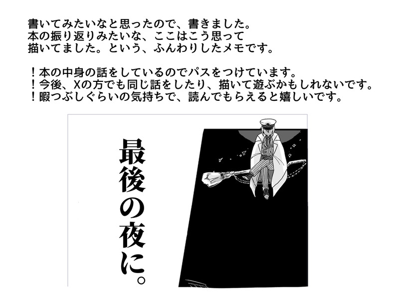 moaa_wata☆quiet followMEMO因縁if設定本の振り返り話です。パス:どちらか悩んで、採用しなかった方のタイトル。(あとがきで呟いています。) show hide show all(+6 images) Tap to full screen (size:1161x849).Repost is prohibited Let's send reactions! freqpopularsnackothersPayment processing Replies from the creator Follow creator you care about!☆quiet follow moaa_wataPROGRESS11月のオカ/パロ本の進捗詰めです。サンプル予定のページや、下書きとか色々✍️!)発行までに描き直し変更等あります!がんばるぞ〜〜!🤦✊ 9 moaa_wataMEMO因縁if設定本の振り返り話です。パス:どちらか悩んで、採用しなかった方のタイトル。(あとがきで呟いています。) 7 moaa_wataMEMO魔法使い/人間のオーカイ本の話です。本のコマを引用せずに、Xに上げた漫画を引用して説明しているところもあります。パス:最後のページ(22P)でオーエンが発した台詞。 7 recommended works YuLDONEオーカイバレンタイン(安定の遅刻) 4 m5_blDOODLE(オーカイ)カの髪の毛がすき m5_blDOODLEオーカイ shiro4_27MOURNINGオーカイと猫、両片想い?なのだろうかこれは設定とか文章がいろいろおかしい文字書きさんはほんとすごいと思う、尊敬する……………… 7273 shiro4_27DOODLE単にすけべな絵が描きたかったと言っており 2 るんるん日本人DONE1周年スト後 オーカイハマってすぐ書いたやつ るんるん日本人DONEオーエンの甘え方 オーカイ魔法舎次元のオカ、当社比あまあま 3 _papapa_pan_DOODLE妖狐と高校生 asaoda4MOURNINGネカ前提のブネカ(魔法舎)r18絵が上手かったら描いてたネタ供養 452