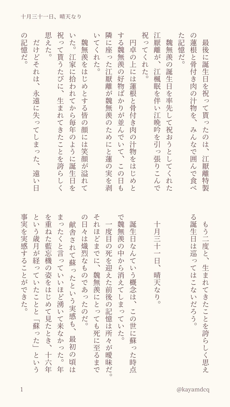 kayamdcq☆quiet followMOURNING知己魏嬰がみんなに誕生日を祝われる話 show all(+11 images) Tap to full screen (size:1854x3276).Repost is prohibited Let's send reactions! freqpopularsnackothersPayment processing Replies from the creator Follow creator you care about!☆quiet follow kayamdcqMENUJOREFESのお品書きです🔑イベント共通パスワード kayamdcqMOURNING両片思い知己が一緒に眠る話丑の刻になると決まって静かな足音が聞こえてくる。妖魔鬼怪の類かと思いきや、その気配は非常に穏やかで温かな気配を纏っていた。 4 kayamdcqMOURNING藍湛と再会した魏嬰が雲深不知処から立ち去ろうとする両片思い知己の話 2 kayamdcqMOURNING新年快乐新年を共に過ごす両片思い知己の話 4 kayamdcqMOURNING忘羨ワンドロお題『あなたの最高の忘羨』道侶となった忘羨の眠れない夜の話。寒さに震えて眠る夜も、孤独に押し潰されそうになる夜も、もう永遠に来ることはないから一一 4 kayamdcqMOURNING藍湛誕生日両片思い知己ではじめて過ごす一月二十三日の話 4 recommended works 畑耕しマンDOODLE💙青いお兄さん💙 Mino_llmDOODLESideMの絵 65 Kyou_o9DOODLE黒要要 / yaocest「俺は……このCPの生産者に……なるんだ……!!」と思って描いたものの作画コストの高さに殺された絵描き初心者の残骸これをCPと言っていいのか みせてみろDOODLE🍥🐬︎︎ ♀知り合いの結婚式で再開する話3 5 かなえDOODLEDom/Subユニバースのなと…さん 2 aya.tDOODLE記録用 Xにページメーカーであげたクロス耳かけ薪さんお礼文 2024.12.19 661 LunaDOODLEふみ天SS ※四肢欠損 1694 OxAlis075DOODLE何も考えずに描いたらくがきいでんのりょーまといぞーが好きってだけ hoshinoTRPG2DOODLE夜半の口寄せげんみ❌