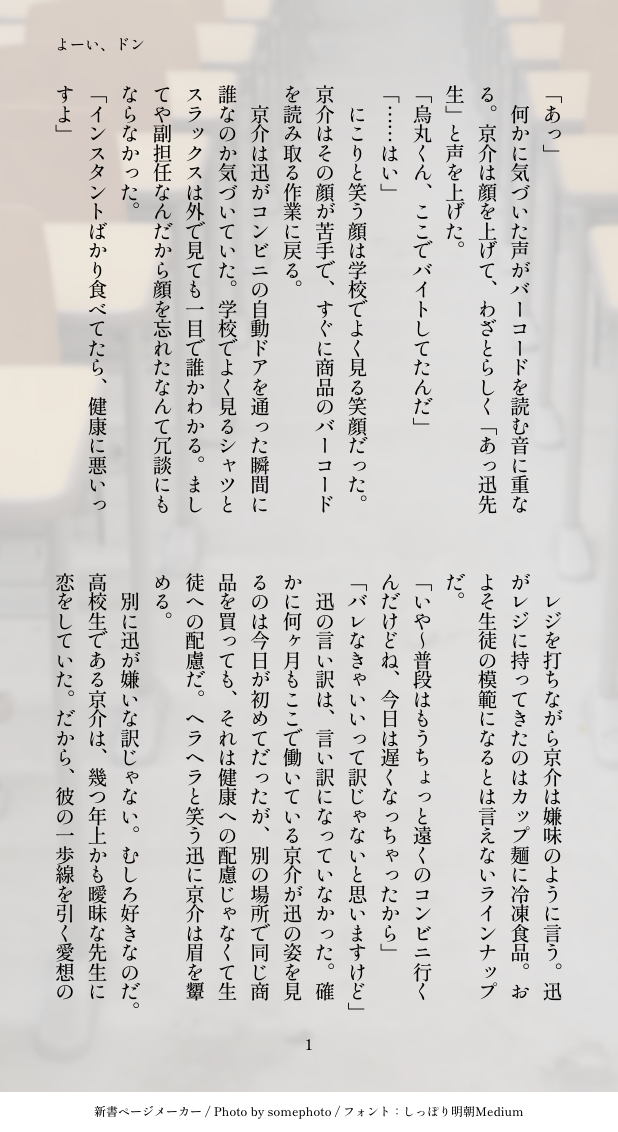 !あまだれ!☆quiet followDOODLE生徒×先生の烏迅です。悩める高校生京介くんが吹っ切れるまでのお話。この先生に未来を見る力はないですが、人より察しがいいみたいな感じだと思います。まだ迅さんにとって京介くんは可愛い生徒の一人。 show all(+3 images) Tap to full screen (size:618x1132).Repost is prohibited Let's send reactions! freqpopularsnackothersPayment processing Replies from the creator Follow creator you care about!☆quiet follow !あまだれ!DOODLE烏迅先生×生徒で学パロシリーズ最後です。烏←迅の報われない話にしてしまいました。京介くん先生は何一つ気づいてないです。この世界にボーダーはないけどSEだけはあるので、こちらは訳もわからず未来視を持って育った迅さんになります。ちょっとかわいそう。押せ押せアピール迅さんにするか迷った末、正反対の性格になりました。報われてほしいね。 3 !あまだれ!DOODLE教師×教師の学パロ烏迅です。押せ押せ京介くんとなかなか受け入れようとしない迅さんのとあるお昼休みの攻防。かなり恋にうつつを抜かす教師達が出来上がりました。学パロシリーズで一番いちゃついてると思う。残りは先生×生徒だけになりましたね!! 6 !あまだれ!DOODLE迅さんが後天的女体化する烏迅です。ギャグを書こうと思ったら烏迅が惚気て終わりました。楽しい!!女体化迅さんいろんなバリエーションがあっていいと思っていますが、今回はあまり変化はないです。胸はでかい。一応ワンクッション。 6 !あまだれ!DOODLE生徒×生徒の学パロ烏迅烏迅になるきっかけの話です。高校2年生の同級生設定。じわじわと好きを募らせて両思いになって欲しい願望を詰めました。 6 !あまだれ!DOODLE生徒×先生の烏迅です。悩める高校生京介くんが吹っ切れるまでのお話。この先生に未来を見る力はないですが、人より察しがいいみたいな感じだと思います。まだ迅さんにとって京介くんは可愛い生徒の一人。 4 !あまだれ!DOODLE烏迅のポエムたちです。6つ。雰囲気で。 6 recommended works zikee45PASTabo吉良露 5 -幺羽-REHABILI⚠️小雷✖️大安⚠️人体崩坏⚠️剧情炸裂 10 sumizumi_trpgDOODLEキルキルイキル げんみ❌秋頃の自陣 619 Sx2kl4everDOODLE⚠️バニー服、女装⚠️💜💙フォロワーさんの素敵なお話を少しお借りしました、問題があれば削除いたします🙇♀️ 土佐おさDONE道夫〜〜!!誕生日おめでとう!! えい🐟SPOILER青に溺れてキスをする げんみ❌差分 3 あやなDONE通い妻なんだなあ f1ag_trpgSPOILER口渇ルルパ 未通過× 3 kanikani679DOODLEそんなにえろくないうぃぷ