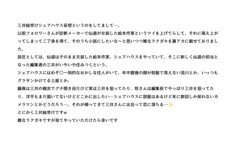 SD受三、仙牧仙、形藤、関西組スキーの成人腐字書き。絵は🔰