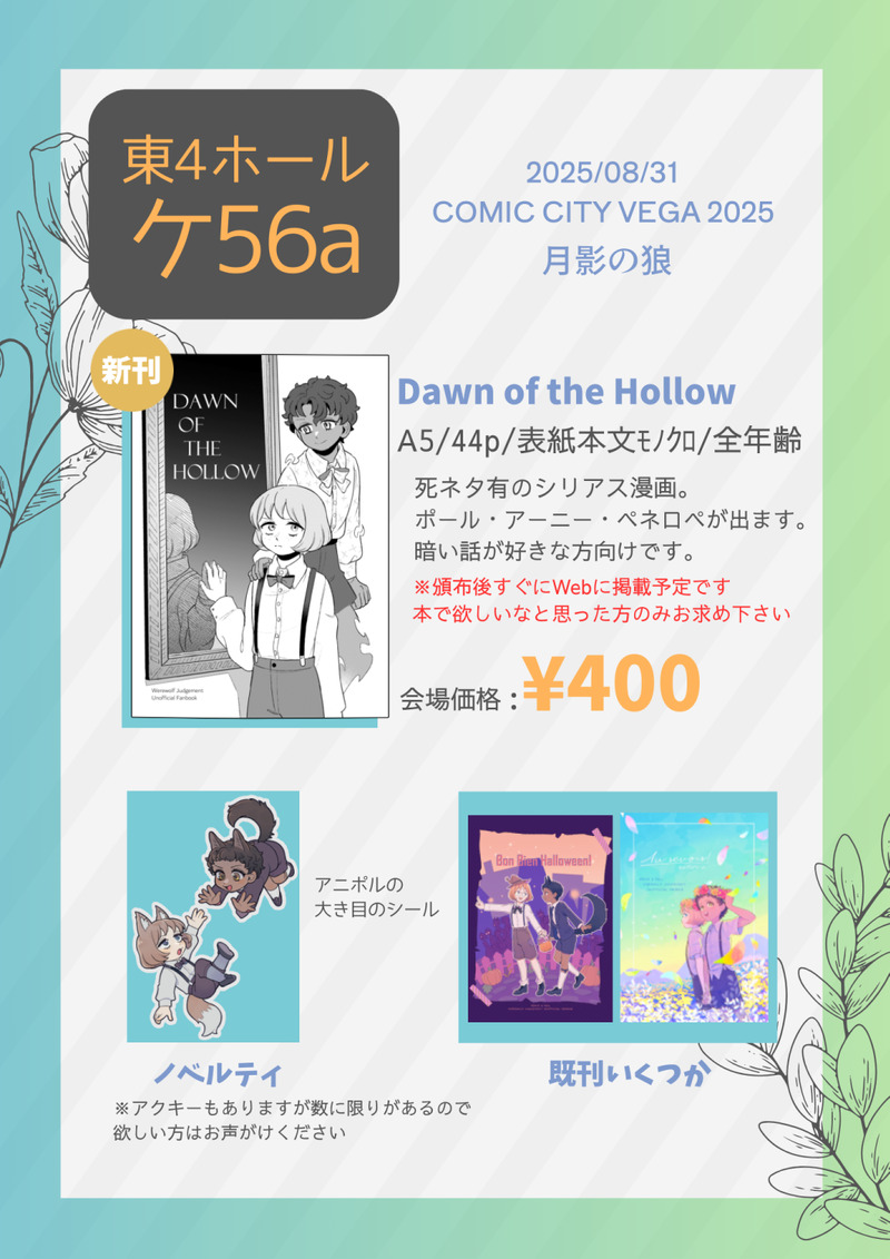 新刊があります、ノベルティ付きます。ダンジョン人狼モチーフのアクキーも作ったので展示もします💐