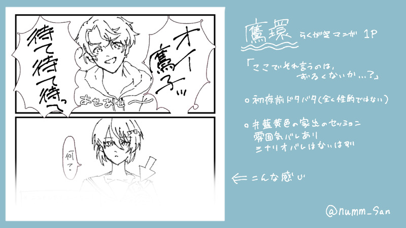 numm_San☆quiet followDOODLE鷹環注意書きなどは1枚目をあおきーろおんりーサークル参加出来なかったので、せめてもの気持ちでリク頂いて描いたもの #鷹環 eagleRing #藍黄色の家出 indigoYellowRunaway show all(+1 images) Tap to full screen (size:2560x1440).Repost is prohibited Let's send reactions! freqpopularsnackothersPayment processing Replies from the creator Follow creator you care about!☆quiet follow numm_SanSPOILER #四宮伊織の襲撃※パロ絵トレスこの図だった 2 numm_SanSPOILER過去絵を使ってイメソンカラオケしたら最高になったので見てください⚠️ぽんのう関連バレ⚠️静なるテロリスタバレ🗝yes 2 numm_SanTRAINING⚠️コスプレ日取真影のコスプレしてた撮影とかではないのでリストバンドの柄が無かったりジャージの柄が違かったりを加工でどうにかしてます⸺⸺。 10 numm_SanSPOILERNPC×🍎リンゴくん誕生日おめでとう 2 numm_SanSPOILER10-08 産まれてきてくれてありがとう。二人が出会ってくれてありがとう。お誕生日おめでとうございます。⚠️ぽんのう関連全てのネタバレ⚠️裏島智衣メイン⚠️全てが捏造 3枚目は智衣くんの誕生日にあげたものと並べたもの 3 numm_SanSPOILERatnrオンリーにて頒布予定のものです※柊紀家、とある幸せな家族の話のネタバレを含みます related works kamishio_0102SPOILERすぎうらきりとさん卓「蛹にはならない」#藍黄色の家出 の落書きまとめです。※ネタバレありなので閲覧注意(22.6.26 追加) 6 kainomakigaiSPOILER #藍黄色の家出 RPバレ 2 okera_333SPOILER好きすぎる、この男…#藍黄色の家出 kakko_kal1SPOILERエモクロアTRPG『蛹にはならない』 #藍黄色の家出 ネタバレ numm_SanDOODLE鷹環注意書きなどは1枚目をあおきーろおんりーサークル参加出来なかったので、せめてもの気持ちでリク頂いて描いたもの 2 ふるいちSPOILER掛け合いがめちゃくちゃ可愛かった…あと鷹子くんがとてもとても性壁にささりました…🥺💓#藍黄色の家出 2 recommended works shikikaDOODLEめちゃくちゃかわいかった。 3 shoki_0827SPOILER冒頭のやりとりが大好きなので#終帳探偵事務所その参点伍#ぽんのう 8 はないDOODLE藍黄色なんてね 見た記念 酸性塩分SPOILER #日取兄弟 一生抜け出せません いくら語っても足りない素敵な物語をありがとうございました。ツイ元https://twitter.com/_enbooooon_/status/1441007626385457152?s=20 9 桃胡ちょこSPOILER かえんDONEhttps://youtu.be/DI2a_Ryg1boの画像まとめです。 48 かえんDONEhttps://youtu.be/oXOSvt8DRZY の画像まとめです。 16 史恵(しえ)SPOILERもう大丈夫 #厨二組の夜 桐製の鈴SPOILER #上手く生きられない水原さんいよいよ今日ですね!楽しみです!(震え) 3