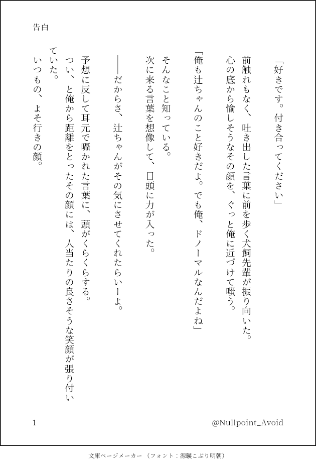 Nullpoint_Avoid☆quiet followDOODLE浮かんだとこだけ #犬辻 tsuji Tap to full screen (size:630x928).Repost is prohibited Let's send reactions! freqpopularsnackothersPayment processing Replies from the creator Follow creator you care about!☆quiet follow Nullpoint_AvoidPROGRESS付き合ってる犬辻。女装攻め。来年2月の吾が手で本になってたら褒めてください。#おれの後輩が世界一かわいい 925 Nullpoint_AvoidDOODLE浮かんだとこだけ Nullpoint_AvoidDOODLEお題メーカーさんより『ごめんね、諦めて。』 related works いさな🌱DONE鉄は熱いうちに打て!🧛♂️犬辻パロ/全年齢版です。時代は中世ヨーロッパくらいな雰囲気で…名前は漢字ですがそこら辺は全体的にファンタジーということで…。吸血鬼の知識は雰囲気で察してください。詳細は不明。俺は雰囲気で話を書いている…。以下注意事項です。苦手な方はご遠慮ください。・遺体が出てきたりします・🦕ちゃんが痛くて可哀想な描写が多々あり・メリバかもしれない? 12172 モモセDONE6/24真ん中バースデーおめでとう犬辻󠄀ぬる〜〜〜いセンシティブ 1645 nibosi_deluxe2DOODLE「ホラつじちゃん笑って〜〜❤️」※犬辻 rosso_addictPAST昨年発行した犬辻Dom/Subユニバース本『きみのエンドルフィンおれのドーパミン』のブースト御礼につけていた犬辻女装攻の話です。 5493 rosso_addictDONE犬辻ワンドロライ開催ありがとうございます!シチュエーションに悩んでなぜか帰宅難民になる犬辻の話です。 1318 モモセMEMOメモに「大学進学に伴い一人暮らしを始めた大学1年生犬飼くん×合鍵渡されて24時間いつでも来ていいよされて本当に頻繁に下宿を訪れる高3辻ちゃん」があったけどアップできても進学時期逃しそうなので落書き供養犬辻の最中の落書きは保存し忘れてとんだ いさな🌱DONE付き合って別れた🐶と🦕ちゃがカラオケでお互いお互いのこと思って歌っちゃう話。引用ガッツリなので、支部には一生載らないです。 6686 kagiyaDONEじゃれ合う犬辻 腐気味「夏の日辻ちゃんがひんやりシートで首とか拭いた後に先輩がふーって息吹きかけてヒーッってなる辻ちゃんが見たいです。そのまま麦茶ック」というリクエストに応えました。(最後応えてない) 2 みやふDONEハロウィンびっくりしたなぁ~~~~~!?!?!??!?? recommended works みやふDONE犬辻/「お待たせしました」ってなんだよ(キレ) 柚子ひなたDONE犬辻の死ネタです 2269 柚子ひなたDONE昔付き合ってた辻ちゃんの結婚式に呼ばれる先輩の犬辻です辻ちゃんがモブの女の子と結婚する描写と、嘔吐表現があります 1784 Ali_ShihinoDONEエワからのご訪問ありがとうございます!2枚目にネップリ番号あります。3枚目以降に短い漫画があります。ネップリ報告めちゃくちゃ嬉しいです。メンションつけていただければ、いいね!させていただきます。絵文字だけのリアクションも嬉しいです! 7 rosso_addictDONE✘含まれません ラブラブ ハッピー○含まれます 犬辻 罪悪感 賢者タイム去年みたいな楽しい0721じゃなくてすみません!ただの癖です! 3389 類の足ふきDOODLE루이쯔카 4 大遅刻DOODLE※痛そうな沢がいますやりたかったものやっと描けました🐤 2 rosso_addictDONE1224は犬辻の日!!ということで、書き込み足りないながらもなんとかつじちゃんへ片思い中の先輩の話を書きました。 1979 Tanadaaaaaa1DONEリクエスト 21