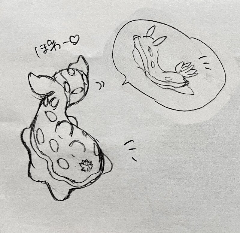本物のウミウシと違っておしりにかわいいひらひら(エラのこと)がない…としょげるトリトドンちゃんにタンポポをつけてあげたら、「ぐちょのおしりもかわいいぽわ!」て自信満々の笑顔を見せてくれるトリトドンという最高のネタ