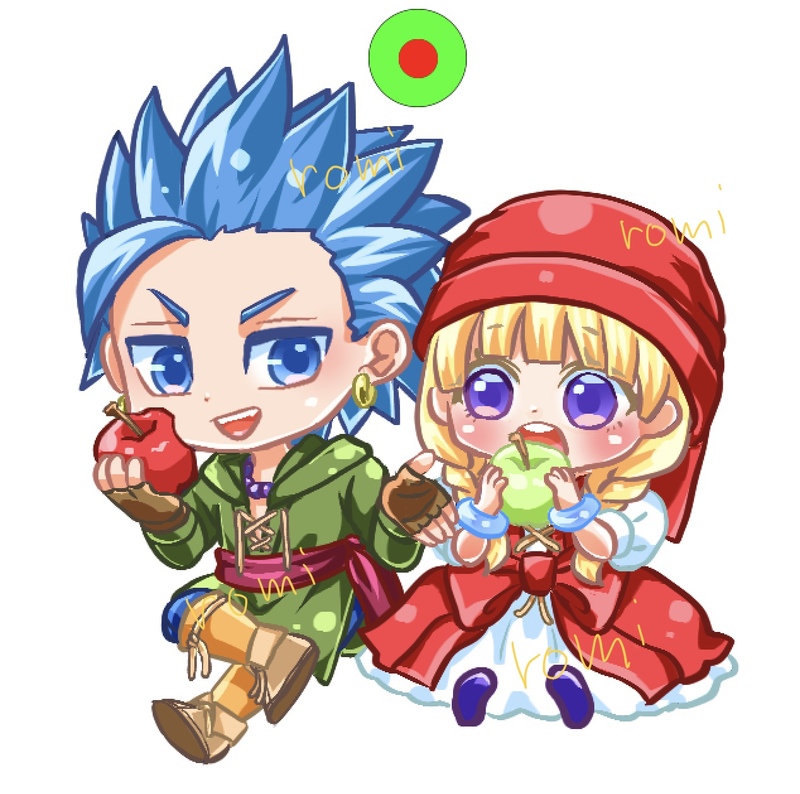 おたクラブさんでアクキーが一個から作れるお試しキャンペーン用に描いたカミュベロちゃん😚🍎🍏(二次利用防止のためサイン書いてます)