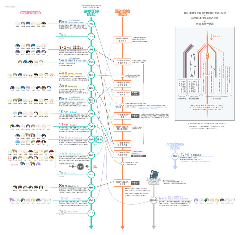 むすべ☆quiet followSPOILER【虚伝~綺伝のネタバレ含む】刀ステの時系列表です1枚目は全体図2枚目は実際の公演順と劇中の時系列の比較3~4枚目は全体図の右側メインと左側メインまた更新したらそのうち差し替えるよ~ show all(+3 images) Tap to full screen (size:5554x5335).Repost is prohibited Let's send reactions! freqpopularsnackothersPayment processing Replies from the creator Follow creator you care about!☆quiet follow むすべSPOILER2023.07.23~08.03【刀ステ無料配信】時系列まとめ用置き場です(外伝から)。Twitterよりも多少高画質なのでこちらに。【全9枚】虚伝/義伝/外伝/ジョ伝/悲伝/慈伝/維伝/科白劇/天伝/无伝/綺伝【追記】詳細なドネタバレ有りのまとめもあります。こちら↓https://poipiku.com/5192743/6765298.html 9 むすべSPOILER【虚伝~綺伝のネタバレ含む】刀ステの時系列表です1枚目は全体図2枚目は実際の公演順と劇中の時系列の比較3~4枚目は全体図の右側メインと左側メインまた更新したらそのうち差し替えるよ~ 4