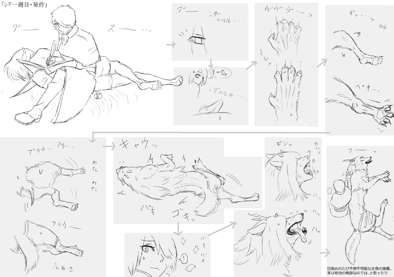 1枚目→アリシア一週目。まだ獣化見慣れてない。人が獣に堕ちる瞬間、病の容赦の無さにビビる。