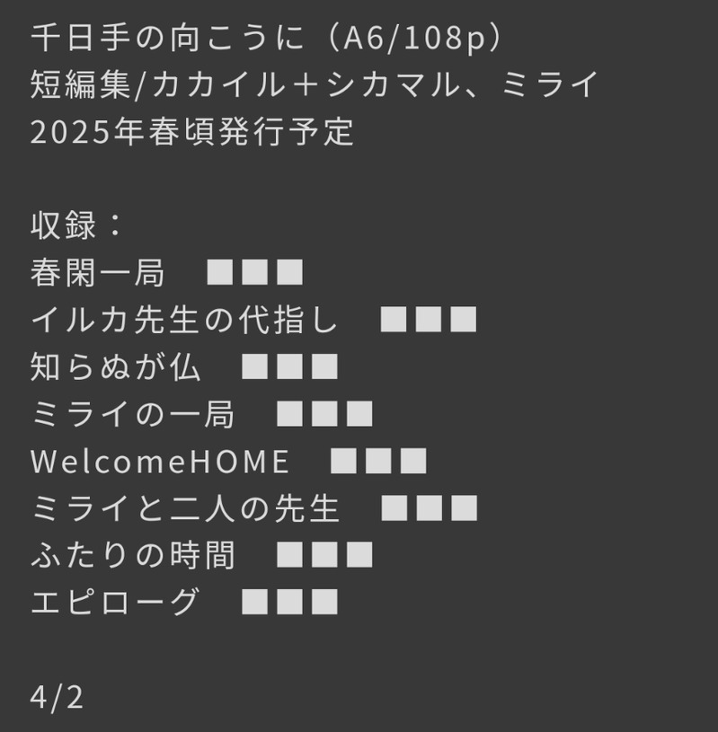 さわら☆quiet followPROGRESSカカイル中心の全年齢本、進捗。将棋を通してシカマル、ミライがカカイルと絡む話。書き下ろしは2話。残りはpixivで読めます。部数アンケ(X) https://x.com/sawaragomu/status/1906372156302262721pixiv https://www.pixiv.net/novel/series/13222654 show all(+5 images) Tap to full screen (size:864x881).Repost is prohibited Let's send reactions! freqpopularsnackothersPayment processing Replies from the creator Follow creator you care about!☆quiet follow さわらDOODLE「先にいたずらしたからお菓子あげないよ」「えっっ!」 さわらTRAININGカカイルSSアカデミーの室内訓練場で体を動かす🍆🐶と見学する🐬先生文庫ページメーカーです。全5頁1900字くらい 5 さわらTRAININGカカイル。🐬先生が風邪ひきはじめ文庫ページメーカーです。全6頁2千字弱 6 さわらDOODLEれんしゅう 2 さわらDOODLE さわらDOODLE recommended works マイナス1DOODLEにょたりあ達が自分のグッズを持ってるイラストがバンバン上がると信じてるともかくグッズ可愛い… cwcDONE #ヘタリア¡Feliz cumpleaños! 2 とえる/坂街DONEろしちゃん、君は、美しい!!! もみじDOODLEこの作品に出会わせてくれてありがとうございます。大好き。#キタユメありがとう マイナス1MAIKINGカラーパレットのろのろたまに無駄に手が上手くなるの謎 suzimuso423DOODLE描き初めチョピンさん omelonmelonDONE獣化メリカ meriDOODLEだまれT親分 しるしるPAST