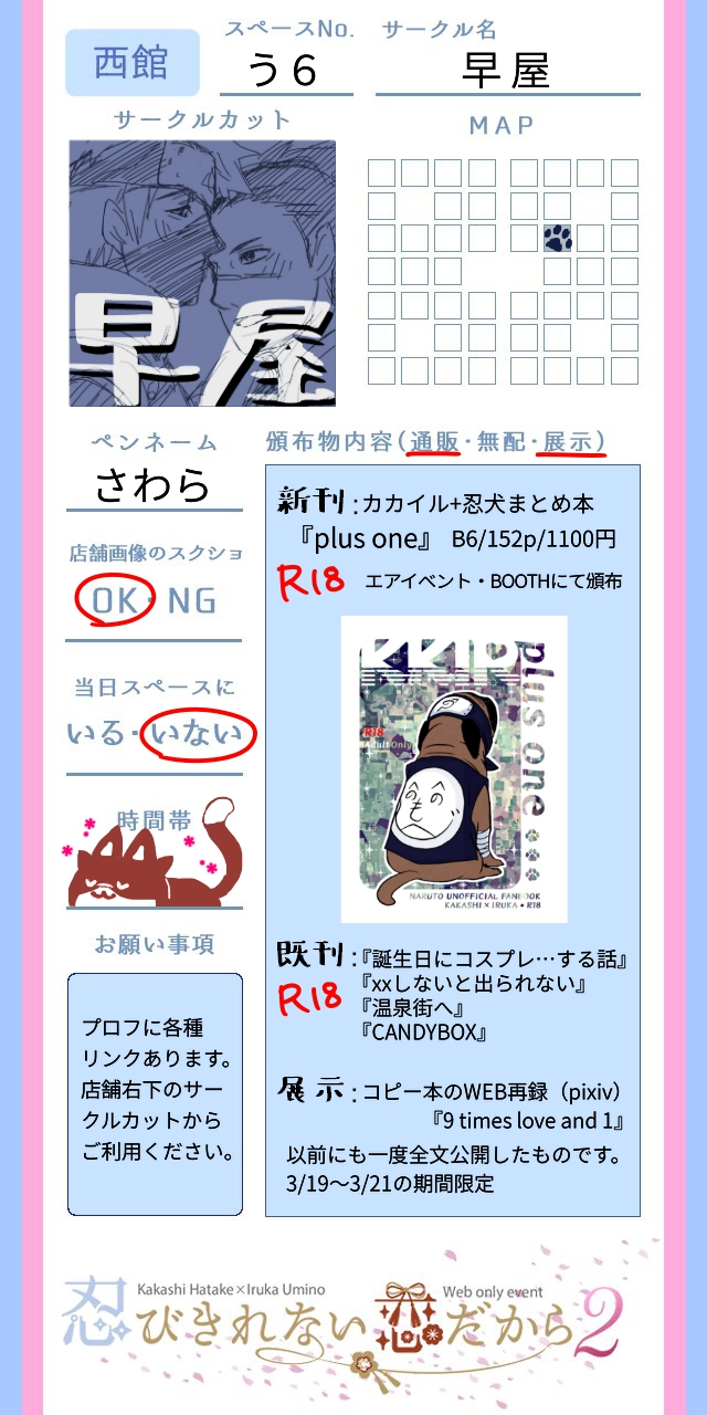 さわら☆quiet followMENU3/20しの恋2のお品書きです。2枚目は各本の大雑把な説明。既刊が多くなってしまったので作りました。BOOTHには既刊の在庫が無い為、既刊をお求めの方はエアイベントをご利用ください。 show all(+1 images) Tap to full screen (size:640x1280).Repost is prohibited Let's send reactions! freqpopularsnackothersPayment processing Replies from the creator Follow creator you care about!☆quiet follow さわらTRAININGカカイルSS🎃ハロウィンに行く少年たち🍆🐬文庫ページメーカーです。全4頁1200字程度 4 さわらDOODLE「先にいたずらしたからお菓子あげないよ」「えっっ!」 さわらTRAININGカカイルSSアカデミーの室内訓練場で体を動かす🍆🐶と見学する🐬先生文庫ページメーカーです。全5頁1900字くらい 5 さわらTRAININGカカイル。🐬先生が風邪ひきはじめ文庫ページメーカーです。全6頁2千字弱 6 さわらDOODLEれんしゅう 2 さわらDOODLE recommended works kmtnabeDONE #ギルベルト#ヘタリア マイナス1DOODLE子キツネちゃん 月光🌛CAN’T MAKEりとかわ とえる/坂街PAST2016〜2017くらいの自主練絵とか続きかかへんやろうな〜っていう描きかけのやつとか 27 __Sattva__TIRED何だかもう続きを描かない気がする...... みんとTRAININGいぎりちゅで初めての厚塗り ぽぷりMAIKING年賀状にひよこんび描きます🤗💕 ちくりんTRAININGサディクさん ちくりんDONEげるまんさん