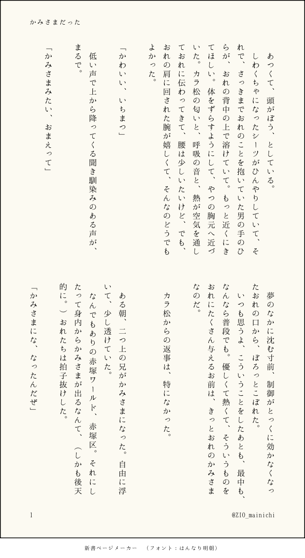 ちゃじよ☆quiet followDONE初めて最後まで書ききれたので、記念に!感想などいただけると最高ハッピーでうれしいです!変な日本語たくさんだと思いますが、雰囲気で読んでもらえるとうれしいです。よろしくお願いします。 show all(+10 images) Tap to full screen (size:618x1132).Repost is prohibited Let's send reactions! freqpopularsnackothersPayment processing Replies from the creator Follow creator you care about!☆quiet follow ちゃじよDONE夏のカラ一です ちゃじよDONE初めて最後まで書ききれたので、記念に!感想などいただけると最高ハッピーでうれしいです!変な日本語たくさんだと思いますが、雰囲気で読んでもらえるとうれしいです。よろしくお願いします。 11 ちゃじよSPUR ME捏造いつもの弁シェリ+虎カラちゃんの母の日です弁出ないし捏造ヤバすぎるのでこちらに。 ちゃじよDONEおれいちちんまりで展示していたイラストです。20241124ありがとう💓自分絵公式絵ごちゃ混ぜです💙💜 9 ちゃじよDONE黛のウェブオンリーにて展示している作品です。枚数が少なくて申し訳ない…パスワードは黛のデビュー日数字3桁です。 4 ちゃじよDONE⚠️自分絵夢のニートピアで展示していたイラストです。枚数少なくて申し訳ないです🥲松野おそ松のクラスメイトになりたい人生だった。🌟パスワードは「夢はビッグな○○○○○○○○○」 2 recommended works 七草粥DOODLE季あく R18 (微)pass: 18↑ y/n 2 ぽいかべDOODLEウが弱ってるデウみたいなの描きたいな〜と思ったけど、難しいですね…2、3ページのコマ割りが一緒で私が笑って泣いてる😂練り直していつか清書できたらいいな 4 みかみREHABILI※腐 R-18 アロヴァン「素股」 鍵🔑18歳以上でBLに理解のある方ですか?「yes/no」 3 おたまDOODLE 鶏(とり)DOODLE成長差アルマシュ 4コマ enuk3815DOODLE2024アナログらくがきたち大掃除で発掘したので描いた時期はバラバラです今年は一枚絵をたくさん描きたいけど多分小説ばっかり書くと思います。どっちも頑張りますのでよろしくお願いします。 37 森野クマ3PROGRESS今日の進歩4783コマ目の線画終わり。手に時間かかったな kz_manju50INFOCoC ‖ やさしい朝をくださいねKP/KPC:きのみ/鎧塚朝生PL/PC:かぼちゃん/空木こまエンドA -両生還-↑CoC ‖ プルガトリウムの夜KP:りんねさんHO1:木の実/鎧塚朝生HO2:かぼちゃん/空木狛エンドA -両生還- 3 suimikyonDOODLE過去絵発掘しました