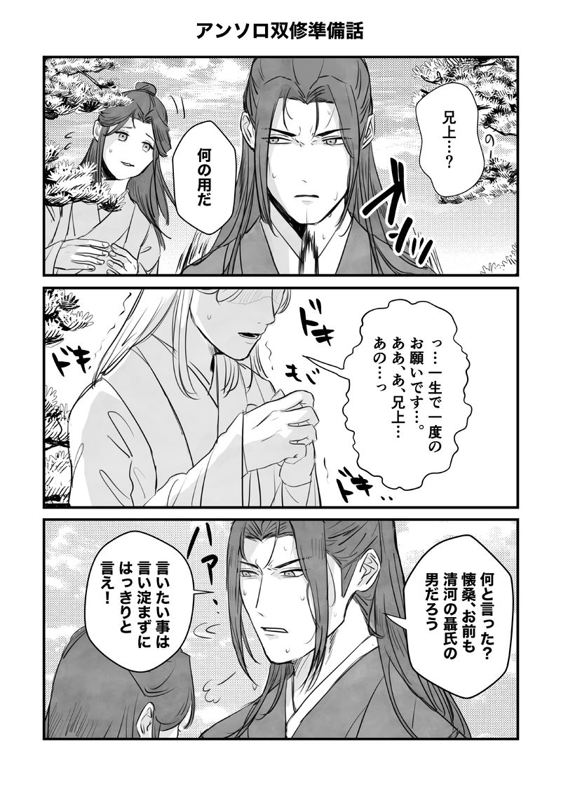 Kaneda_cql☆quiet followMOURNING明懐アンソロに寄稿させていただいた原稿の没部分をなぜか漫画にしたやつです。※ラジドラビジュ、もちろん全年齢向けです。 show all(+9 images) Tap to full screen (size:3496x4961).Repost is prohibited Let's send reactions! freqpopularsnackothersPayment processing Replies from the creator Follow creator you care about!☆quiet follow Kaneda_cqlDONEイベントのご感想ありがとうございました!のおまけです。明玦視点。 3 Kaneda_cqlDONE棺とお別れする話。※多大な捏造を含みますのでご注意下さい。※イベント前時間取れなさすぎてほぼ下書きです…!読みにくくて申し訳ないです! 32 Kaneda_cqlDOODLE成化イベントへのご感想ありがとうございました!なおまけです。現代AUポスター?でショートケーキのいちごの部分をあげる隋州、しっかり顔が隋州で大好きです🍓 Kaneda_cqlPASTロックの日なんだ!去年の本のおまけのバンド懐明。別に直接的なことはないけど懐明です!注意してください。ギタリストがやるギターをぐいってやって後ろにやるやつ好き。 9 Kaneda_cqlDOODLE懐桑お誕生日おめでとう🎂昨年の誕生日の続き。ブラザーのラブがボーイズのラブに思われたら困るので一応ポイピク 4 Kaneda_cqlDOODLEメイドの日!聶明玦がメイド服です。一応前回の話はこれですが(https://x.com/kaneda_cql/status/1788610773218099673)別に読まなくていいです。 14 recommended works ゆめじの素焼きDOODLE魔道祖師と緑土の落書き。 14 tamayura830PAST子供江澄まとめ 4 sasao_ZOYSDONE藍湛はぴば トダジュンMAIKING暁星塵と薛洋のEPすごくよかった…宗教画描かなきゃってなった… 紫雨(shigure)DONE暁薛ワンドロワンライ、開催おめでとうございます!大大遅刻かつ、+20minですが参加させていただきます🙇🏻♂️現代AUで、神待ち家出少年薛洋!みたいにしたかったはずなのに…後半の唐突さでギャグみが強い😇後に鬼道の先輩と小悪魔系アイドルユニットとしてデビューするという裏設定があったり? 1768 MimiDONE🐰しぇんしぇんの全体像です… ni*kkoDONE【忘羨】日日是好日 4 はるもん🌸MOURNING散歩してたら運命の相手を発見した魏嬰とその運命の相手、藍湛との恋の始まりのお話。※魏嬰が犬克服してます注意 4280 ni*kkoDOODLE【忘羨】習作