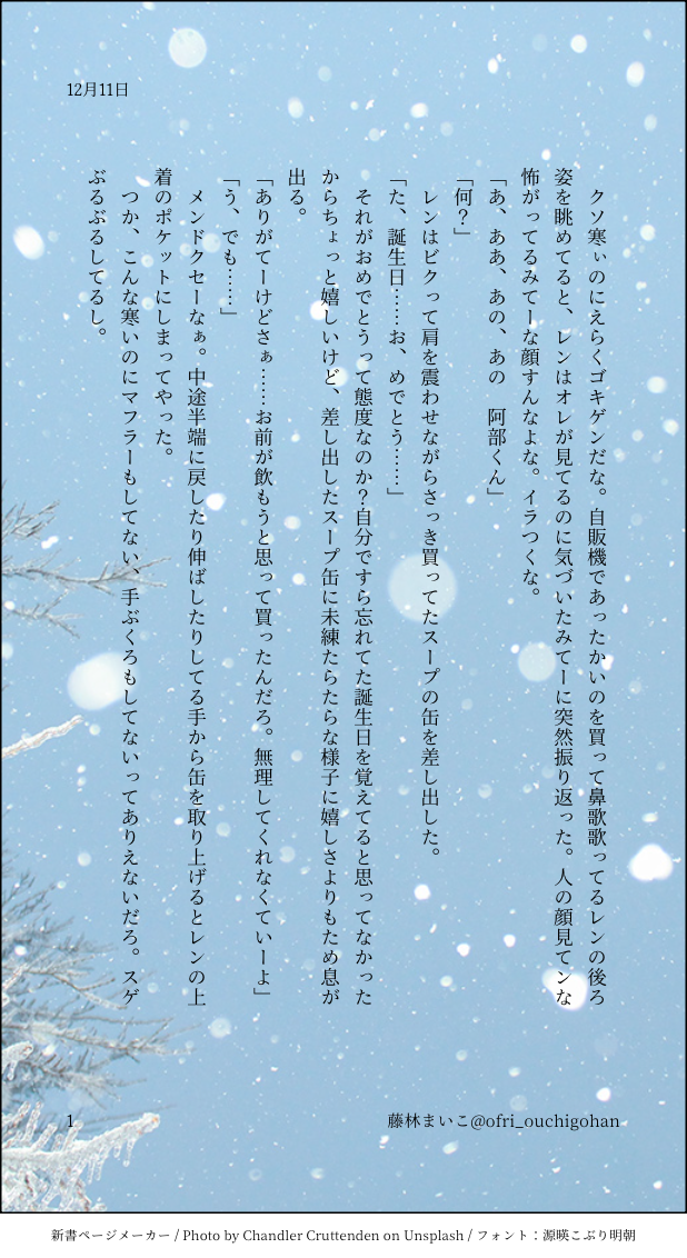 藤林まいこ☆quiet followDOODLEあべくん誕生日おめでとう。自販機前でのみはしくんとのやりとりの一幕です。フツーにハグしたりしますし、赤面したりするような描写があるので見る方によってはアベミハかもしれません。 show all(+1 images) Tap to full screen (size:618x1132).Repost is prohibited Let's send reactions! freqpopularsnackothersPayment processing Replies from the creator Follow creator you care about!☆quiet follow 藤林まいこDONE一緒に暮らすあべくんみはしくんがごはん食べてるだけの話です。 藤林まいこDONE※本誌ネタバレ おお振り本誌の展開の後、家に帰ってそして寝るあべくんが一年前の合宿で志賀先生が言っていた言葉を思い出して時間差でダメージ(?)を食らっている話の改稿版です。 2 藤林まいこDOODLE※本誌ネタバレ おお振り本誌の展開の後、家に帰ってそして寝るあべくんが一年前の合宿で志賀先生が言っていた言葉を思い出して時間差でダメージ(?)を食らっている話です。みはしくんは出てきませんがみはしくんの例のセリフは出てきます。 藤林まいこDONE今日起きる前に思いついた、あと5分ってねばるあべくんVS早く起きてって起こそうとするみはしくんの話です。抱き合って寝ています。 藤林まいこDONE一緒に暮らすあべくんみはしくんがご飯食べてるだけの話あべくん視点です(2022年12月分) 2 藤林まいこDONE一緒に暮らすあべくんみはしくんがごはん食べてるだけの話です。 2 recommended works nakanakanakano_DONE 2 yururu0312DONE無理やり気味シャアムです一部トレス有18歳以上の方はyesでどうぞ! harusakirikuPAST【SNS投稿SS再録】現パロ:サーファー×バイト2本あり もだもだ 7113 すずめもなDONEWでおめでとうございます!2024.12.20 hajisiri_akaSPOILERリョナ好き目線で見た感想です。ネタバレを大いに含みます事故を防ぐためパスワードを設定してます。パスワードは公開日の数字4桁です。 237 (´;ω;`)DOODLE@ BLACKKDOGG 블랙이 메리 크리스마스...! namaDONEうちのこまとめ3 6 momijiDOODLE少ないですが、これまでに投稿したナルミツ絵です!※1/1更新:1枚追加しました。 4 s_🍵PROGRESSいっぱいいるだろ!!!って情緒乱しながら描いてる