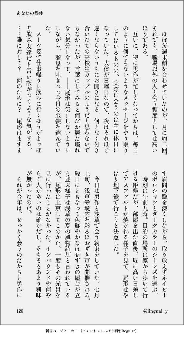 lingnai_y☆quiet followDONE勇尾小説『あなたの得体』10イマジナリーフレンドの「あにさま」といつも何となく不調の勇、突如現れた尾の話。の続きです。ツイートの数字を入力してください。 show hide show all(+24 images) Tap to full screen (size:618x1132).Repost is prohibited Let's send reactions! freqpopularsnackothersPayment processing Replies from the creator Follow creator you care about!☆quiet follow lingnai_yDONE勇尾小説『あなたの得体』11イマジナリーフレンドの「あにさま」といつも何となく不調の勇、突如現れた尾の話。の続きです。これで第二章はおわりです。ツイートの数字を入力してください。 29 lingnai_yDONE勇尾小説『あなたの得体』10イマジナリーフレンドの「あにさま」といつも何となく不調の勇、突如現れた尾の話。の続きです。ツイートの数字を入力してください。 25 lingnai_yDONE勇尾小説『あなたの得体』9イマジナリーフレンドの「あにさま」といつも何となく不調の勇、突如現れた尾の話。の続きです。ツイートの数字を入力してください。 19 lingnai_yDONE勇尾小説『あなたの得体』8イマジナリーフレンドの「あにさま」といつも何となく不調の勇、突如現れた尾の話。の続きです。ツイートの数字を入力してください。 9 lingnai_yDONEゆうおランド開催おめでとうございます!やはりこのジャンルでキメセ……といえばラッ●鍋だろうということで、鍋でキメる勇尾の話です。パスワードはリンクページに記載がございます。 21390 lingnai_yDONE勇尾小説『あなたの得体』7イマジナリーフレンドの「あにさま」といつも何となく不調の勇、突如現れた尾の話。の続きです。あなたは成人済みですか?ツイートの書式でお答えください… 12