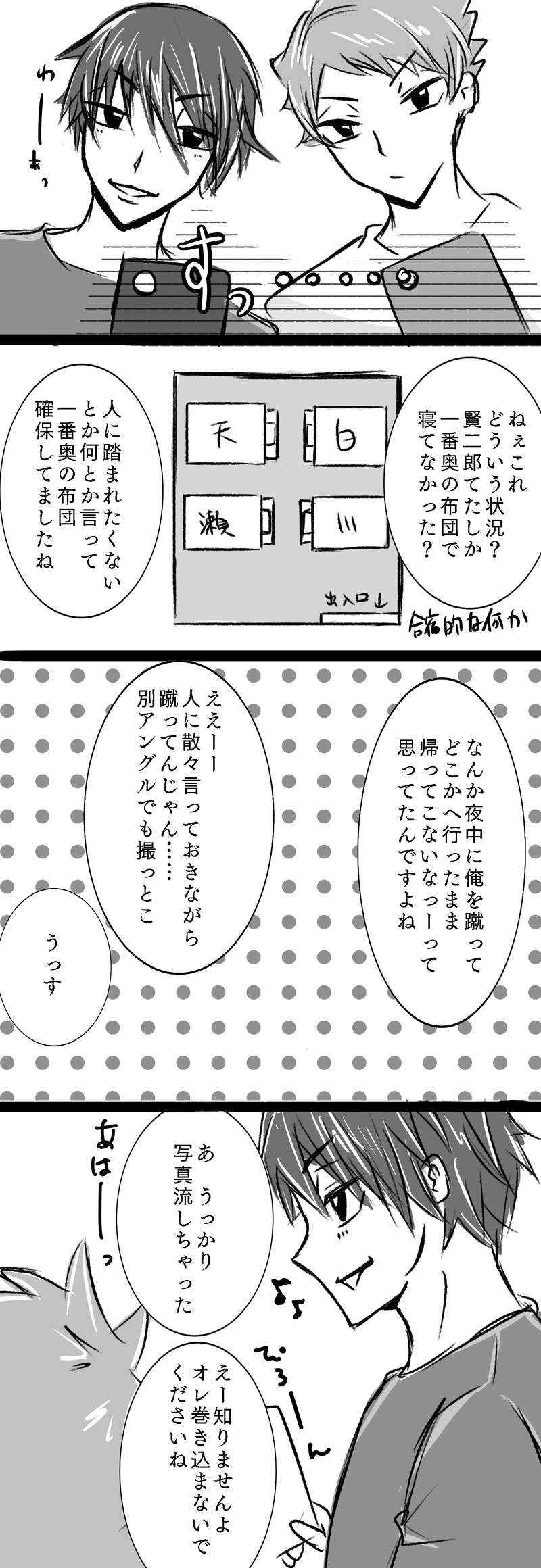 土曜の朝に二人が寝てる絵を描いてから出勤して、仕事中はずっと寝てる二人を目撃してしまった天童川西コンビのやり取りが頭の中をぐるぐるしてたので描いてみた的な。