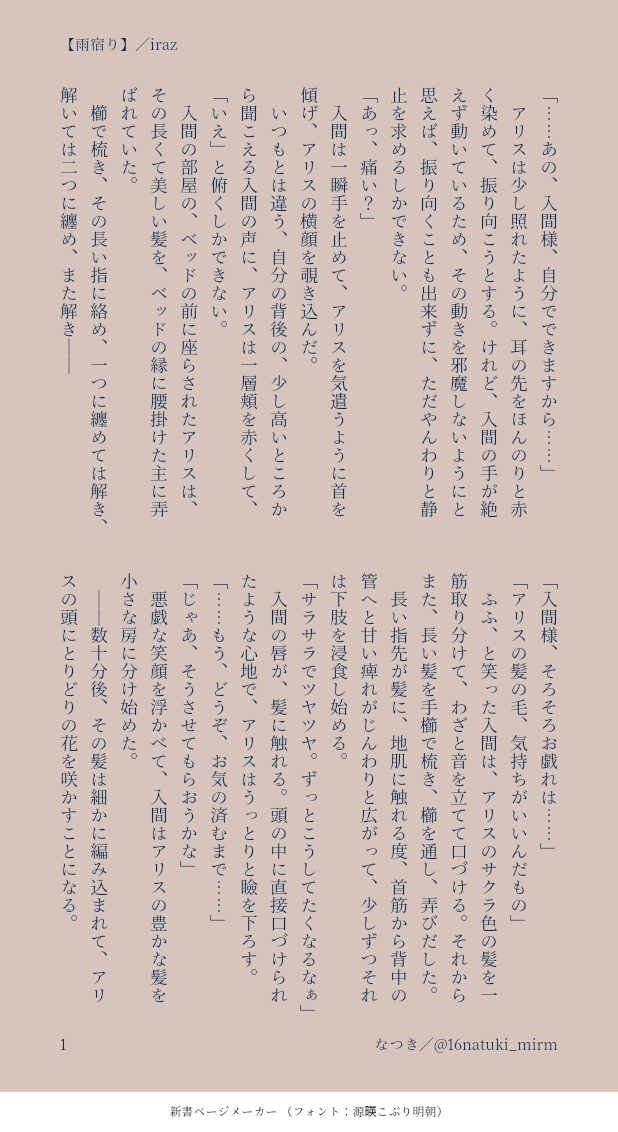 16natuki_mirm☆quiet followDONEリクエストありがとうございました✨あずくんの髪の毛を弄るまち、というお題だったので、弄り甲斐のありそうな長髪の大人あずで。(小説の受付できるのに納品がテキストじゃないと出来ないみたいなので、画像ですみません)素敵なリクエストありがとうございました☺️ #イルアズ iluaz. Tap to full screen (size:618x1132).Repost is prohibited Let's send reactions! freqpopularsnackothersPayment processing Replies from the creator Follow creator you care about!☆quiet follow 16natuki_mirmDONE敬語禁止ゲームをやらされる腹心様のおはなし。 4567 16natuki_mirmDOODLEワンドロ「猫耳」用に描きかけてたのが、期限過ぎてしまったのでお焚き上げ。見るなー!撮るなー!! 16natuki_mirmDONE先日のいる明日とらマルシェのWebアンソロに寄稿していた短編。テーマ「バレンタイン」で。魔界におけるバレンタインの設定は捏造です。 2091 16natuki_mirmDONEナルシスノワールするイルアズのお話のリリーちゃん視点。何でも許せる人向けなので、心配な方は「ナルシスノワール」で検索してパロ元の歌詞をご覧頂ければ……いつか長編にしたいんですよ。 6539 16natuki_mirmDONE1/28の悪学で無配にしたセパソイです。イルアズしてるイルマくんに片思い?しているソイソイと、そんなソイソイに片思いしているセパくんによる、いつかセパソイになるセパソイ。 5097 16natuki_mirmMAIKING「家族と過ごす日」の続きちょこっと 2415 related works にゃるそこないDOODLEIQ3ぐらいのイルアズ toco_mirmMAIKINGiraz キスチャレンジ 4 ひよりDONEイルアズ 初夜 本番無し 3ページのサクッとした漫画です。※アズがベビー○ールを着てるので女装注意 3 にゃるそこないDOODLEn番煎じですが。 4 にゃるそこないValentine無自覚なおふたり 3 椎さささDOODLE大人イルアズ🔞 toco_mirmMAIKINGつきあってるazとirのまんが 3 にゃるそこないDONE猫の日なのでネコミミです ワタなべPROGRESSおっぱい recommended works yuuka_amDOODLE黄身は可愛いバレリーナ#創作#アナログ#ワンドロ きょむDONEワンドロ「さくらんぼ」 ゆたかTRAININGワンドロさくら誕生祭! R._unknownDOODLETwitter某お題ワンドロ絵。お題【エプロン】タイムラプス、Twitterにあげてます。 Ba.DONEワンドロとか 4 ときめきジャムリアルDOODLEお題「スキュラ」でタコだけどちょっとイカがわしい女の子です··· アコヤDONE #ゼノクロワンドロ【お題】17:00〜19:00 (夕方に関するなにか)真秀ら浜でのんびり。2020.03.08 mob_oji_xTRAININGプリニーに愚痴るエミたん私もちっこいプリニーがほしい下絵を30分もやっていたので色を塗れなかった のむくんDONE江ワンドロ①お題:初めての… 2