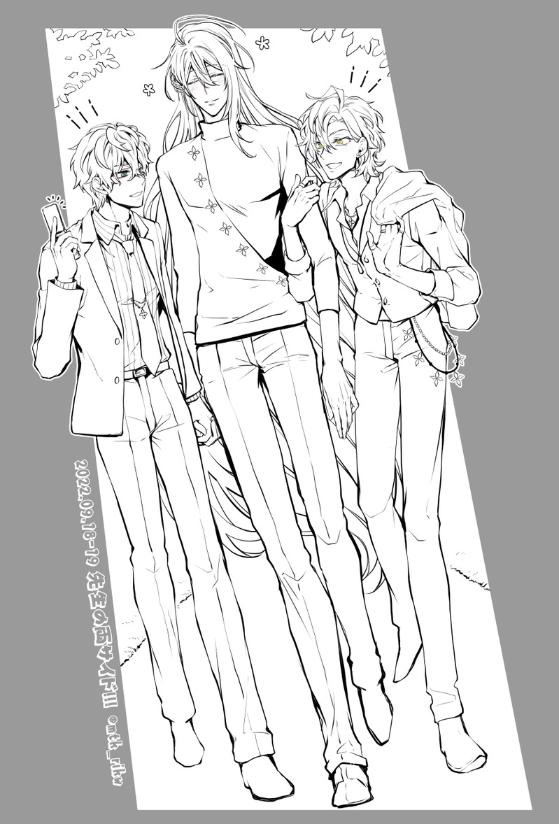 今回の展示はイベントフライヤーに合わせて、色々な所に出かけてってデート満喫してるまてんろイラストになっています。普通のチーム交流に見えて、実は3人で交際中だし、なんなら夜までガッツリコースのガチデート(今回時間がなくて夜ターンのイラストはナシ/いつか描きたい)な先生と両サイド。色塗りも間に合ってないですが、色彩補完、妄想補完してお楽しみくださいっ