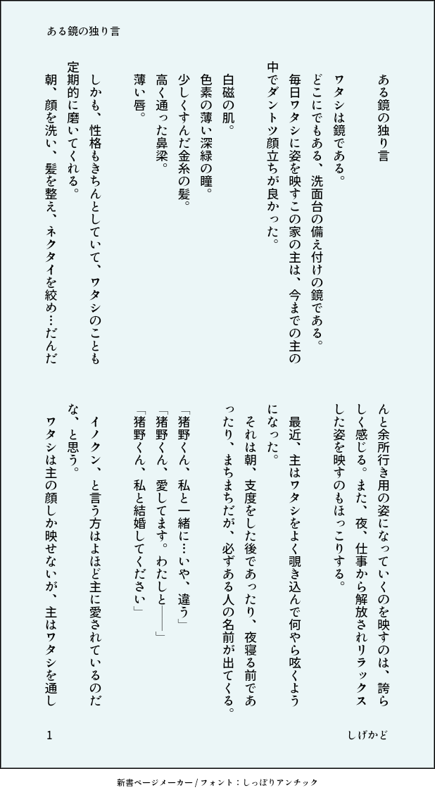 しげかど☆quiet followMENUある鏡の独り言・プロポーズの裏舞台 #七猪 show all(+2 images) Tap to full screen (size:618x1132).Repost is prohibited Let's send reactions! freqpopularsnackothersPayment processing Replies from the creator Follow creator you care about!☆quiet follow しげかどMENUジュソ七×ジュソ猪『楽しい呪詛師生活⑨』エイプリルフールネタ。相変わらず変なことしかしてません。お付き合い後すぐなので、まだ話し方に遠慮があります(笑)パス:猪くんの好物 6 しげかどSPOILER猪くん再登場で浮かれてる感想。どうにかして七猪に落としこもうとしているので最終的に七猪最高!な話になってます。ネタバレです。 2 しげかどMENUジュ術師七×ジュソ師猪第3段相も変わらす七がおかしいです。二次創作は妄想の産物であり、原作とは違うのは大前提なのですが、さらに輪をかけて皆おかしいです。ジュ……の世界観で七と猪という名前のキャラが出ている話なら何でも大丈夫!って人向けです。 4 しげかどMENU甚猪♀第4段伏パパは恵ママのことが、いのちゃんは七サンのことが、この世で一番好きなんだけど、それでも、なんやかんや仲良くやってる二人です。あと、いのちゃんはそこそこ名の知れた術師の家系で、かつ副業で儲けてるおうちのお嬢様というマイ設定をぶっ込んでます。 8 しげかどMENU七猪。お題メーカーの睡眠○もの。本番はないけど、始終あやしいのでパス付き。相変わらず七みが残念です。 パス(いのくんの苦手な食べ物を平仮名で) 4 しげかどDONEジュソ七×ジュソ猪シリーズ⑧お題メーカーで出た、睡カンものです。例のごとくこの二人はノー○ックス ノーライフなので、おかしなことになってます。がっつりいたしているのでパスつき。パスは猪のくんの好物。 5 related works すずめだいDOODLE⚠️にょた七猪♀楽じゃないはなしえちの話ですがほぼえちではないです 5 すずめだいDONE⚠️にょた七猪♀素敵ツイートから描かせていただきました 3 すずめだいDOODLE⚠️にょた転生七猪♀いのちゃん当時19歳の話 7 すずめだいDOODLE⚠️にょたぱーかーわnぴいのちゃん 3 すずめだいDOODLE⚠️にょた灰(27)と七猪♀転生パロの七猪♀途中ツイートによる雑説明が入ります 11 しげかどMENU七の積ん読の本を遺品として受けとる猪。フォロワーさんの呟きからできました。私は、本は紙派なので、七もそうであって欲しい。 4 すずめだいDONE⚠️にょた七猪♀まろで頂いた生理ネタです 5 すずめだいDOODLE⚠️にょた転生七猪♀幸せそうですその代償におとなオブおとなな七はいません 4 すずめだいDOODLE⚠️にょた少ないですが七猪♀もっと描こうとしたんですけど時飛んだんで… 2 recommended works ね🍋のDOODLE inokun_prprDONE愛のことばを教えて / 七猪性描写あります→ パスワード18歳以上 y or n ? 2 野良クオッカDONEシスネハ(?)事後表現 薄暗い しげかどMENUうざがらみ 8 しげかどMENU今日と任務の話・七猪♀・彼シャツの続き 5 しげかどMENUまとめ買い 3 しげかどMENU京都任務の話④・七猪♀続き 2 しげかどMENUカスクート七猪 4 ナツハラMAIKING「誤算」R18です※イラマ 5