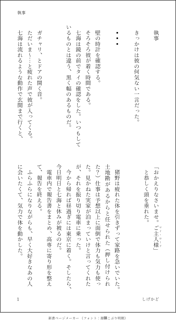 しげかど☆quiet followMENU七猪ワンドロライ「執事」 #七猪ワンドロライ show all(+3 images) Tap to full screen (size:618x1132).Repost is prohibited Let's send reactions! freqpopularsnackothersPayment processing Replies from the creator Follow creator you care about!☆quiet follow しげかどMENUジュソ七×ジュソ猪『楽しい呪詛師生活⑨』エイプリルフールネタ。相変わらず変なことしかしてません。お付き合い後すぐなので、まだ話し方に遠慮があります(笑)パス:猪くんの好物 6 しげかどSPOILER猪くん再登場で浮かれてる感想。どうにかして七猪に落としこもうとしているので最終的に七猪最高!な話になってます。ネタバレです。 2 しげかどMENUジュ術師七×ジュソ師猪第3段相も変わらす七がおかしいです。二次創作は妄想の産物であり、原作とは違うのは大前提なのですが、さらに輪をかけて皆おかしいです。ジュ……の世界観で七と猪という名前のキャラが出ている話なら何でも大丈夫!って人向けです。 4 しげかどMENU甚猪♀第4段伏パパは恵ママのことが、いのちゃんは七サンのことが、この世で一番好きなんだけど、それでも、なんやかんや仲良くやってる二人です。あと、いのちゃんはそこそこ名の知れた術師の家系で、かつ副業で儲けてるおうちのお嬢様というマイ設定をぶっ込んでます。 8 しげかどMENU七猪。お題メーカーの睡眠○もの。本番はないけど、始終あやしいのでパス付き。相変わらず七みが残念です。 パス(いのくんの苦手な食べ物を平仮名で) 4 しげかどDONEジュソ七×ジュソ猪シリーズ⑧お題メーカーで出た、睡カンものです。例のごとくこの二人はノー○ックス ノーライフなので、おかしなことになってます。がっつりいたしているのでパスつき。パスは猪のくんの好物。 5 related works しげかどINFOプロポーズ 6 しげかどDONEエイプリルフール 4 しげかどMENU呪霊 6 しげかどMENU強制連行 7 しげかどMENUカスクート七猪 4 しげかどMENUメイド 5 しげかどMENUまとめ買い 3 しげかどMENUうざがらみ 8 しげかどMENU彼シャツ 6 recommended works しげかどMENU今日と任務の話・七猪♀・彼シャツの続き 5 しげかどMENU京都任務の話②七猪♀ 3 しげかどMENU小松菜 2 しげかどMENU七猪ワンドロライ「執事」 4 しげかどMENUむめさんとの合作第3段『彼シャツ』から続く先天性女体化いのちゃん。つまりは七が不憫…… 5 しげかどMENUむめさんとの合作第8段『彼シャツ』から続く女体化いのちゃん。二人がちゃんと?話をします。 9 しげかどDeep Desire書き納め②七猪一年生ズも出てきます。そして、猪くん=可愛いと誰しも認識されてる世界(笑) 2 しげかどMENU『白いうさぎが誘う─第六夜─』七猪♀オリジナルキャラがでます。ようやく一区切りです! 13 しげかどMENU七×ジュソ猪『墓場まで持っていく』死ネタ注意 16