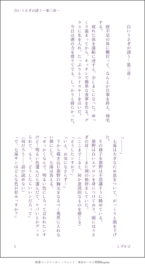 しげかど☆quiet followMENUむめさんとの合作第3段『彼シャツ』から続く先天性女体化いのちゃん。つまりは七が不憫…… #七猪 #七猪♀ show all(+4 images) Tap to full screen (size:618x1132).Repost is prohibited Let's send reactions! freqpopularsnackothersPayment processing Replies from the creator Follow creator you care about!☆quiet follow しげかどMENUジュソ七×ジュソ猪『楽しい呪詛師生活⑨』エイプリルフールネタ。相変わらず変なことしかしてません。お付き合い後すぐなので、まだ話し方に遠慮があります(笑)パス:猪くんの好物 6 しげかどSPOILER猪くん再登場で浮かれてる感想。どうにかして七猪に落としこもうとしているので最終的に七猪最高!な話になってます。ネタバレです。 2 しげかどMENUジュ術師七×ジュソ師猪第3段相も変わらす七がおかしいです。二次創作は妄想の産物であり、原作とは違うのは大前提なのですが、さらに輪をかけて皆おかしいです。ジュ……の世界観で七と猪という名前のキャラが出ている話なら何でも大丈夫!って人向けです。 4 しげかどMENU甚猪♀第4段伏パパは恵ママのことが、いのちゃんは七サンのことが、この世で一番好きなんだけど、それでも、なんやかんや仲良くやってる二人です。あと、いのちゃんはそこそこ名の知れた術師の家系で、かつ副業で儲けてるおうちのお嬢様というマイ設定をぶっ込んでます。 8 しげかどMENU七猪。お題メーカーの睡眠○もの。本番はないけど、始終あやしいのでパス付き。相変わらず七みが残念です。 パス(いのくんの苦手な食べ物を平仮名で) 4 しげかどDONEジュソ七×ジュソ猪シリーズ⑧お題メーカーで出た、睡カンものです。例のごとくこの二人はノー○ックス ノーライフなので、おかしなことになってます。がっつりいたしているのでパスつき。パスは猪のくんの好物。 5 related works すずめだいDONE⚠️にょた七猪♀素敵ツイートから描かせていただきました 3 すずめだいDONE⚠️にょた七猪♀まろで頂いた生理ネタです 5 すずめだいDOODLE⚠️にょた少ないですが七猪♀もっと描こうとしたんですけど時飛んだんで… 2 すずめだいDOODLE⚠️にょた灰(27)と七猪♀転生パロの七猪♀途中ツイートによる雑説明が入ります 11 すずめだいDOODLE⚠️にょた転生七猪♀幸せそうですその代償におとなオブおとなな七はいません 4 すずめだいDOODLE⚠️にょた七猪♀楽じゃないはなしえちの話ですがほぼえちではないです 5 すずめだいDOODLE⚠️にょた転生七猪♀いのちゃん当時19歳の話 7 すずめだいDOODLE⚠️にょたぱーかーわnぴいのちゃん 3 しげかどMENU七の積ん読の本を遺品として受けとる猪。フォロワーさんの呟きからできました。私は、本は紙派なので、七もそうであって欲しい。 4 recommended works sleepA_ppleMOURNING趣味モリモリに詰め込んだ意味なしオチなし知力なしの七猪五出てくるけどからかってるだけでなんも関係ないごめんね五 6556 sleepA_ppleDONE七誕をお祝いする猪の七猪LINE今できるのはこれくらいだ…… 2 しげかどMENU雨・七猪♀・京都任務の話の先の話 3 しげかどMENU強制連行 7 しげかどMENUメイド 5 しげかどMENU雨宿り・七猪♀・雨の続き 5 しげかどMENU小松菜 2 しげかどMENU七猪ワンドロライ「執事」 4 ナツハラDONEジュソジュソ七猪「桎梏」七くんは猪ちゃんのこと大好きだけど、猪ちゃんは七くんのこと大嫌い!七くんからのちょっかいに嫌気がさした猪ちゃん、あわよくば殺されようと思って手合わせ願ったら、なんでか七くんのモノにされちゃって…?!次回!猪のお尻、死す!ドゥエル・スタンバイ!(作品解説、終わり)違う界隈でま〜えに剃毛プレイ?みたいなのを読んだのを思い出して七猪にやってもらいました 4