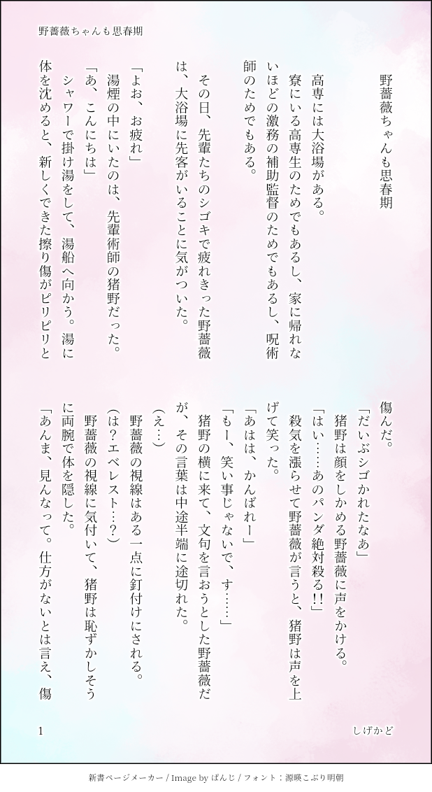 しげかど☆quiet followMENU『彼シャツ』から続く、にょた猪ちゃんシリーズ。虎だけではなく、のばらちゃんも思春期でした。のばらちゃんの台詞がちょいちょい古くさいのは、書いてる人間がそういう年だからです。 #七猪♀ show all(+5 images) Tap to full screen (size:618x1132).Repost is prohibited Let's send reactions! freqpopularsnackothersPayment processing Replies from the creator Follow creator you care about!☆quiet follow しげかどMENUジュソ七×ジュソ猪『楽しい呪詛師生活⑨』エイプリルフールネタ。相変わらず変なことしかしてません。お付き合い後すぐなので、まだ話し方に遠慮があります(笑)パス:猪くんの好物 6 しげかどSPOILER猪くん再登場で浮かれてる感想。どうにかして七猪に落としこもうとしているので最終的に七猪最高!な話になってます。ネタバレです。 2 しげかどMENUジュ術師七×ジュソ師猪第3段相も変わらす七がおかしいです。二次創作は妄想の産物であり、原作とは違うのは大前提なのですが、さらに輪をかけて皆おかしいです。ジュ……の世界観で七と猪という名前のキャラが出ている話なら何でも大丈夫!って人向けです。 4 しげかどMENU甚猪♀第4段伏パパは恵ママのことが、いのちゃんは七サンのことが、この世で一番好きなんだけど、それでも、なんやかんや仲良くやってる二人です。あと、いのちゃんはそこそこ名の知れた術師の家系で、かつ副業で儲けてるおうちのお嬢様というマイ設定をぶっ込んでます。 8 しげかどMENU七猪。お題メーカーの睡眠○もの。本番はないけど、始終あやしいのでパス付き。相変わらず七みが残念です。 パス(いのくんの苦手な食べ物を平仮名で) 4 しげかどDONEジュソ七×ジュソ猪シリーズ⑧お題メーカーで出た、睡カンものです。例のごとくこの二人はノー○ックス ノーライフなので、おかしなことになってます。がっつりいたしているのでパスつき。パスは猪のくんの好物。 5 related works すずめだいDOODLE⚠️にょた転生七猪♀いのちゃん当時19歳の話 7 すずめだいDONE⚠️にょた七猪♀素敵ツイートから描かせていただきました 3 すずめだいDONE⚠️にょた七猪♀まろで頂いた生理ネタです 5 すずめだいDOODLE⚠️にょたぱーかーわnぴいのちゃん 3 すずめだいDOODLE⚠️にょた転生七猪♀幸せそうですその代償におとなオブおとなな七はいません 4 すずめだいDOODLE⚠️にょた七猪♀楽じゃないはなしえちの話ですがほぼえちではないです 5 しげかどMENU七の積ん読の本を遺品として受けとる猪。フォロワーさんの呟きからできました。私は、本は紙派なので、七もそうであって欲しい。 4 すずめだいDOODLE⚠️にょた少ないですが七猪♀もっと描こうとしたんですけど時飛んだんで… 2 すずめだいDOODLE⚠️にょた灰(27)と七猪♀転生パロの七猪♀途中ツイートによる雑説明が入ります 11 recommended works inokun_prprDONE事後 / 七猪軽めの性描写あります→ パスワード18歳以上 y or n ? 2 sleepA_ppleMOURNING猪野君がクソ上層部にセクハラされる話。胸糞ですのでご注意。 2813 しげかどMENU彼シャツ(にょたくまちゃんバージョン) 4 しげかどMENUうざがらみ 8 しげかどMENU小松菜 2 しげかどINFOプロポーズ 6 しげかどMENUカスクート七猪 4 しげかどMENU七猪♀「京都任務の後で②」続きもの。 2 しげかどMENUむめさんとの合作第3段『彼シャツ』から続く先天性女体化いのちゃん。つまりは七が不憫…… 5
