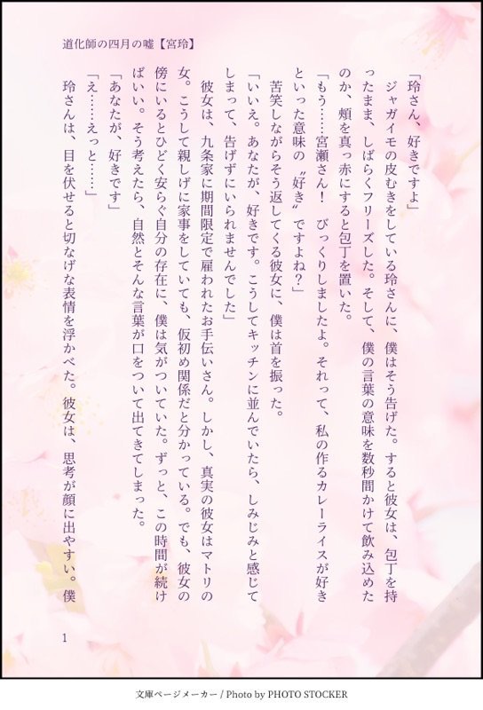 小夜の倉庫☆quiet followDONE「道化師の四月の嘘」(宮玲)/2018.4.1エイプリルフールということで……。 #スタマイ stamae #宮玲 gongLing show all(+2 images) Tap to full screen (size:544x800).Repost is prohibited Let's send reactions! freqpopularsnackothersPayment processing Replies from the creator Follow creator you care about!☆quiet follow 小夜の倉庫DONEスタオケwebオンリーの展示小説になります。パスワードは成宮くんのバースデー4桁で。エロはぬるいですが、お祝いの気持ちを込めました。 6281 小夜の倉庫MAIKINGねこびやに展示予定だったエスエマのできたところまで公開しています。まだRシーンはありませんが、この先がR展開となるため年齢制限をつけてあります。pass:あなたは成人済みですか?【yes or no】 2278 小夜の倉庫PASTスタオケの成宮智治×朝日奈唯です。付き合ってる&やきもちを焼く唯ちゃんです。2021年12月19日に発行した本からの再録になります。(BOOTHにてまだ頒布しています)web再録にあたり、加筆修正しました。 4340 小夜の倉庫DONEスタオケの銀唯です。キスの日ということで書きました!朝日奈が卒業後設定で、二人が付き合ってキスをしています。 2305 小夜の倉庫DONEエミリオ、お誕生日おめでとう!初書きのエミエマです。 6087 小夜の倉庫DONE「花が見ている」(宮玲)/2018.8.13ハピエン後の隠れ家での2人のお話です。 3 related works 小夜の倉庫DONE「誘惑」(宮玲)/2017.12.22初めての宮玲。 小夜の倉庫DONE「苺のショートケーキを召し上がれ」(宮玲)/2018.3.23フォロワーさんのお誕生日プレゼントとして。 7 jun_horai0111swDONE学園パロ体育教師宮瀬先生と新米教師玲ちゃん。 4 小夜の倉庫DONE「秘密のキス」(宮玲)/2018.1.9 2 小夜の倉庫DONE「白に包まれ」(宮玲)/2018.2.19本編未完結の時期に書いたものなので、しんどい感じになっています。 4 karuustar8DONEにっこり幸せな宮玲を描きたかった 小夜の倉庫DONE「独占」(宮玲)/2018.1.15 4 小夜の倉庫DONE「ひとつまみの愛があるなら」(宮玲)/2018.5.3宮瀬本編が佳境に入る中、しんど過ぎて書きました。 4 小夜の倉庫DONE「本当のあなたを愛します」(宮玲)/2018.1.10 3