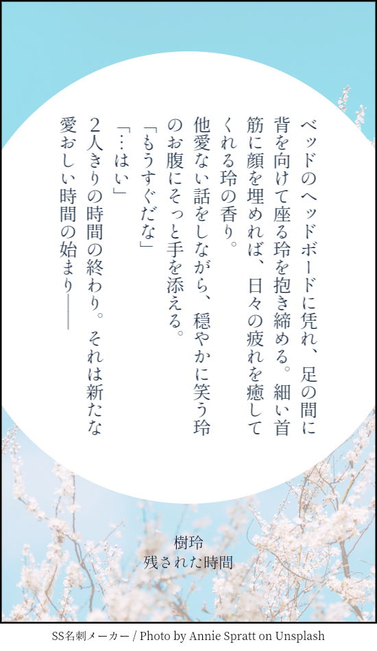 かなかな☆quiet followDONETwitterで上げた140字SSまとめ①診断メーカーさんの140字SSのお題で書いたものをまとめました。140字で書く練習(*^-^*)2つオーバーしてるけど…。できるだけ定期的に上げて、増えてきたらここにまとめます。 #スタマイ#樹玲#耀玲#渡玲#峻玲#140字SSお題 show all(+3 images) Tap to full screen (size:550x950).Repost is prohibited Let's send reactions! freqpopularsnackothersPayment processing Replies from the creator Follow creator you care about!☆quiet follow かなかなDONE『ソファーで寝てしまった相手を起こそうとして腕に触れたら相手が起きたので「ベッドに行こう」と声をかけたらゔーんて唸りながら抱き着いてきた。甘えん坊さんめ』ていう感じのお題だったと思います。スクショ、リンク共に行方不明になってしまったので、ここに投げます。同じお題で1,2枚目は蒼生さんver、3,4枚目は玲ちゃんverです。リハビリクオリティです……。 4 かなかなMOURNING『ルーロンの日』に上げる予定だったSS。大遅刻なんでこちらに。 7 かなかなDONETwitterで上げた140字SSまとめ①診断メーカーさんの140字SSのお題で書いたものをまとめました。140字で書く練習(*^-^*)2つオーバーしてるけど…。できるだけ定期的に上げて、増えてきたらここにまとめます。 4 かなかなDONE『# キスシーンを14字で書く』のまとめ②。Revel、瀬尾研の順で全て玲ちゃん視点と対の分(槙君、羽鳥さん、瀬尾さんの単体は入れてない)。玲ちゃん視点とセットにした分はTwitterに1枚も上げてないけどこちらにアップ。 9 かなかなDONE『# キスシーンを14字で書く』のまとめ。捜査一課、九条家、都築兄弟、峻玲、成玲の順。すべて玲ちゃん視点と対になったもの(男性陣単体視点は入れてない) 15 かなかなTRAININGスタマイログストの破壊力に初めて作ったあいうえお作文。蒼玲です。 related works jun_horai0111swDONE初書き宏玲初デート(仮)の一幕とでも思って頂ければ|*・ω・) 2 saya_starmoonDOODLEお試しぽいぽい。司玲ちゃん。#スタマイ 小夜の倉庫DONE「白に包まれ」(宮玲)/2018.2.19本編未完結の時期に書いたものなので、しんどい感じになっています。 4 小夜の倉庫DONE「恋は人を愚かにする」(誠玲)/2018.1.21誠玲も増やしたい……。 6 小夜の倉庫DONE「Marking」(潔玲)/2018.3.2プライベートでの潔くんの嫉妬台詞があまりにエモかったので。 5 うめ@眠いPASTお試しで過去絵#スタマイ #宮瀬豪 雨音 鈴DONE桧山さん🎉お誕生日おめでとう!!ギリギリ間に合った~ペン入れはアナログでやってみました。いつも桧山さんの言葉に励まされます。強さとは、温かさであり、優しさ。これからも桧山さんを応援していきたいなぁ。 カヤコDONEstmyイメージお題企画よりお借りしたお題で♡耀玲×2、関玲、渡玲の4話 6 jun_horai0111swDONEフォロワーさんとの企画で、「春」と「ほんわか」のテーマで書いた蒼玲ちゃんです❤素敵なタイトルをフォロワーさんに考えてもらいました~(∩˘ω˘∩ )♡ 4