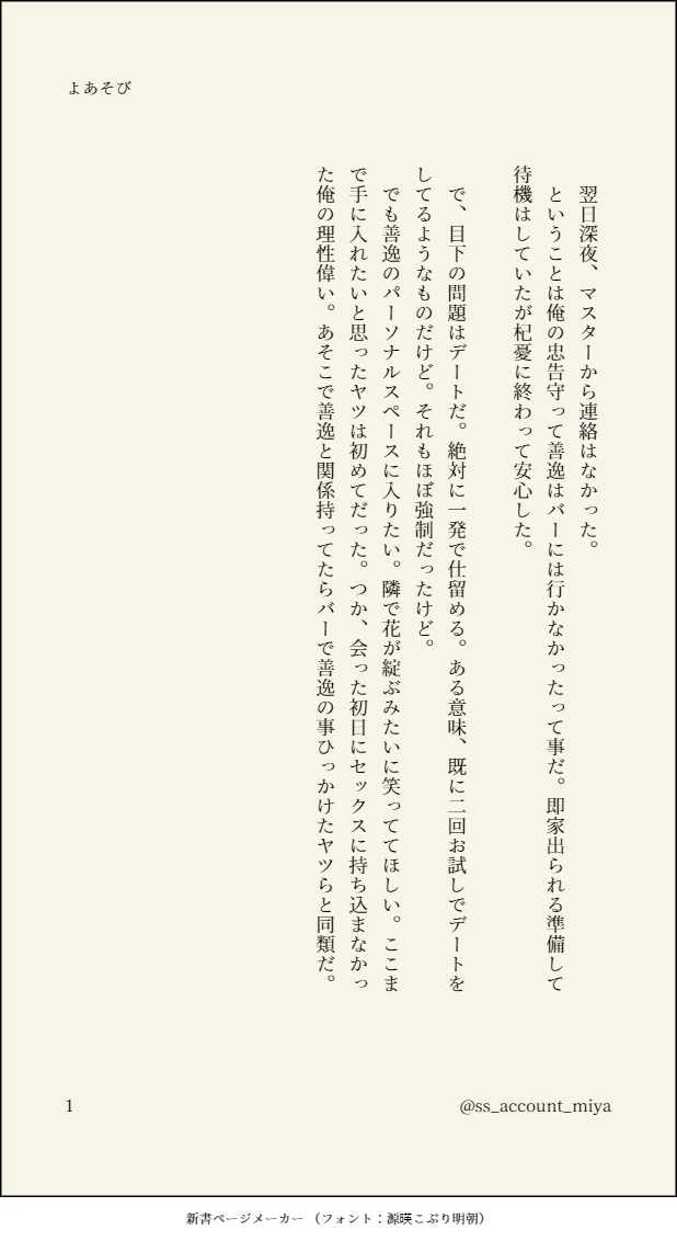 miya☆quiet followMOURNINGよあそび⑤ #宇善 theEmperorsPersonalEffects show all(+6 images) Tap to full screen (size:618x1132).Repost is prohibited Let's send reactions! freqpopularsnackothersPayment processing Replies from the creator Follow creator you care about!☆quiet follow miyaTRAININGフiッiトiワiーiクの軽い宇さんに強引に付き合わされ、美i味iしiいi物i食iべに行く宇善の話。の5話目。全年齢今回は食いだおれの街大阪に行きます。この後は…今書いてるのですが、upは少し後になりそう、そしてR18。長くなりそう。ぼちぼち書いて出来たらいつかのタイミングでupします。 9 miyaTRAININGフiッiトiワiーiクの軽い宇さんに強引に付き合わされ、美i味iしiいi物i食iべに行く宇善の話。の4話目。全年齢今回は閑i人i閑i話。本筋から反れて疲れちゃった宇さんを食欲で満たす善の話。なんとなくお互いに宇→←善な関係だったらいいな、っていう話。ふわっと書いてるので宇(教i師)×善(大i学i生)くらいの設定です。10/8のオンリーでこの続きを展示予定です。 4 miyaTRAININGフiッiトiワiーiクの軽い宇さんに強引に付き合わされ、美i味iしiいi物i食iべに行く宇善の話。の3話目の二日目です。全年齢今回は北i海i道に一i泊i旅i行。…の続き(2日目)なんとなくお互いに宇→←善な関係だったらいいな、っていう話。ふわっと書いてるので宇(教i師)×善(大i学i生)くらいの設定です。細かい事考えてないので相i違あったらすみません。 6 miyaTRAININGフiッiトiワiーiクの軽い宇さんに強引に付き合わされ、美i味iしiいi物i食iべに行く宇善の話。の3話目です。全年齢今回は北i海i道に一i泊i旅i行。さすがに北i海i道は日i帰iりだとね、って思って。なんとなくお互いに宇→←善な関係だったらいいな、っていう話。ふわっと書いてるので宇(教i師)×善(大i学i生)くらいの設定です。細かい事考えてないので相i違あったらすみません。 7 miyaTRAININGフiッiトiワiーiクの軽い宇さんに強引に付き合わされ、美i味iしiいi物i食iべに行く宇善の話。の2話目です。全年齢なんとなくお互いに宇→←善な関係だったらいいな、っていう話。ふわっと書いてるので宇(教i師)×善(大i学i生)くらいの設定です。細かい事考えてないので相i違あったらすみません。 5 miyaTRAININGフiッiトiワiーiクの軽い宇さんに強引に付き合わされ、美i味iしiいi物i食iべに行く宇善の話。全年齢なんとなくお互いに宇→←善な関係だったらいいな、っていう話。ふわっと書いてるので宇(教i師)×善(大i学i生)くらいの設定です。細かい事考えてないので相i違あったらすみません。 3 related works isonouraMOURNING竹林と宇善が描きたかった落書き。力尽きたのでここに供養。 透DOODLE3徹目に突入し、今どんな感情??って顔の限界宇先生と、あまりに先生が静かに頬を食むのでかえって怯えている善宇善のつもりです!!! 透DOODLEうちの宇善の善くん 唯翔(uitan)DONE宇善/キスだけでイっちゃいそうな善逸。 透DONE神に願う無神論者/宇善※捏造死亡描写あり神の存在自体は信じてない。でも人々が神という絶対的存在を信じられるということは必要だと考えてる宇さん。頑張れれば続くかも 2 にやのPAST善バースデー記念まんが発掘したので上げ(宇善というよりオールキャラ寄りのブロマンスな感じ) Yukari_KurenaiMAIKING♡Happy Valentine's Day♡②#宇善#さねねず 2 miiDOODLE宇は善が大好きなのでちょっとでも拒否されると拗ねちゃったりして。で、毎回めんどくせぇなって思いながら結局善は許しちゃうんだよね☺️(そして倍返しされる)って誇大妄想w 2 矢野絵梨DONE桜の時期が近付いて来ましたね! recommended works はる.TRAINING宇善が好きすぎる ふみか🍊DOODLE⚡️ 3 いちかMOURNINGふぁいるこわれたから供養で途中の… 銀夏@richie_wassonINFO宇善の全年齢二次創作漫画。アナログでもう直ぐ完成します。頒布は未定ですが、何部か刷ります。#鬼滅の刃#宇善 tobitakehikoDOODLEこれはお迎えに来たノリでナンパごっこする宇善 ゆぴ@えち絵DONE0721の日!!!ド性癖なのに気付いたの遅くてただの一枚絵ですう🙁善が一人でしてるだけ。あんまりえちくないけど出てるので気を付けてね🍌🍄画像横なせいで見づらいかも……18歳以上の大人のみ閲覧下さい🙏そして同じ性癖な方はどうか仲良くしてくださいお願いします……🙇♀️ 雾川贝DOODLE酸酸的一篇文 3298 ⑅⃝︎ྀིDOODLE壊れていくカカオと哀川の話。カカオが傀儡たちから哀川を守りきれず、攻撃された哀川本体(人間体)は植物状態になり、結果魂を人形に移しています。人形化と魂の合致には成功したものの、哀川は日常の変化を感じていてー⋯そんな中、皆が集まる場でショコラが倒れてしまうシーンからスタートします。 2 viikaviDONECharacters from my omegaverse webtoon👉👈👀 “My precious diamond”Read here 🔗 m.tapas.io/series/My-Precious-…All links 🔗 viikavi.carrd.co/
