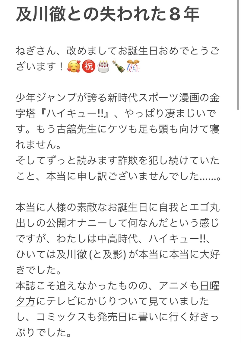tsuyoi_pantsu☆quiet followMOURNINGねぎさんお誕生日おめでとうございます!♡駄文ですが想いをしたためました…! show all(+4 images) Tap to full screen (size:1125x1596).Repost is prohibited Let's send reactions! freqpopularsnackothersPayment processing Replies from the creator Follow creator you care about!☆quiet follow tsuyoi_pantsuMOURNINGねぎさんお誕生日おめでとうございます!♡駄文ですが想いをしたためました…! 5