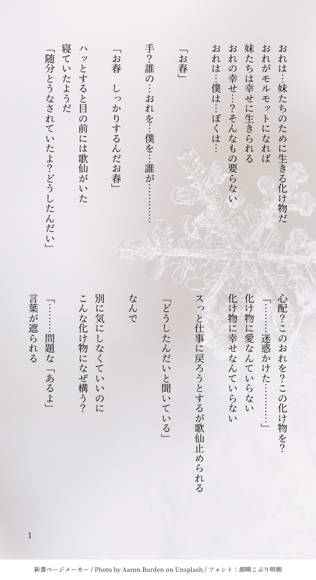 sakura_sani00☆quiet followDONE歌仙が化け物の心の氷を溶かす話キツイ裏設定があるので注意 #桜鬼本丸 onihonmaru show all(+3 images) Tap to full screen (size:618x1132).Repost is prohibited Let's send reactions! freqpopularsnackothersPayment processing Replies from the creator Follow creator you care about!☆quiet follow sakura_sani00MEMO【創作審神者 設定】#うゆ本丸 #桜鬼本丸①だいたいの情報・カラパレ・イメージカラー(ハートの色) sakura_sani00DONE【 #審神者懇親会 #懇親会みぃと肥前 】蘇臣さんにしがみつかせていただきました!!!!!!!!!! 2 sakura_sani00DONE【 #桜鬼本丸 歌+さに】もう大丈夫、怖くないよ 僕がそばにいるからね sakura_sani00DONE【 #審神者懇親会 #懇親会みぃと肥前 】空汰ちゃんと朝ビュッフェいきました!!!!!!!!頑張って1人で運ぶみぃと見守ってくれてる空汰ちゃん♡♡ sakura_sani00DONE【 #審神者懇親会 #懇親会みぃと肥前】うゆ語が理解出来る涛未ちゃん sakura_sani00DONE【 #審神者懇親会 #懇親会春と歌仙 】昏鷹くんと軽く手合わせさせていただきました! related works sakura_sani00DOODLE【 #桜鬼本丸 鬼化春】 sakura_sani00DONEある日の出来事 sakura_sani00DONE【 #審神者懇親会 #懇親会みぃと肥前 #懇親会春と歌仙】付き添い同士の話#桜鬼本丸 の春はほんの少しだけ #うゆ本丸 に所属し関わっていました。うゆ本丸初期刀陸奥守は春を知っている という設定 sakura_sani00DONE【 #桜鬼本丸 歌+さに】もう大丈夫、怖くないよ 僕がそばにいるからね sakura_sani00DONE【 #桜鬼本丸 御手杵が頑張って距離を縮める話】字書きの友人・歌月【https://www.pixiv.net/users/7372333】に軽く改稿して頂きました 8 sakura_sani00MEMO【創作審神者 設定】#うゆ本丸 #桜鬼本丸①だいたいの情報・カラパレ・イメージカラー(ハートの色) sakura_sani00DONE【 #桜鬼本丸 見守り歌仙】 sakura_sani00DONE歌仙が化け物の心の氷を溶かす話キツイ裏設定があるので注意 4 recommended works あずき@本丸DOODLEゆるゆる薬さにマンガ⑨女審神者顔出しです。歌仙さん描けて楽しい。 路上の蛙DOODLEうちの本丸の男審神者。だいたいCoC用のキャラ。刀も使うが役に立った試しがない。 路上の蛙DOODLE君じゃなきゃだめだと 📛DONE加工前!(微々たる物) kitaruna2TRAINING #刀さにお題80分お題:!へしさに ※女審神者 me2fullDONE薬さにです。女審神者顔出し注意。ふわっと読んでやってください。 12 甘味料DONE亀甲と女審神者の個人的な手紙のやりとり『独断場』1/1#本丸コード三四九一七五 940 ユミヲDONEちょぎさにドレスの続き。長義は、あぐりの気づかないところで徹底ガードしています。 なちょこDOODLE[本丸UI]とうらぶアプデの話審神者の双子は電子系つよつよ現代っ子なうえに呑み込みがはやいのですぐ対応できそうだなぁと 4