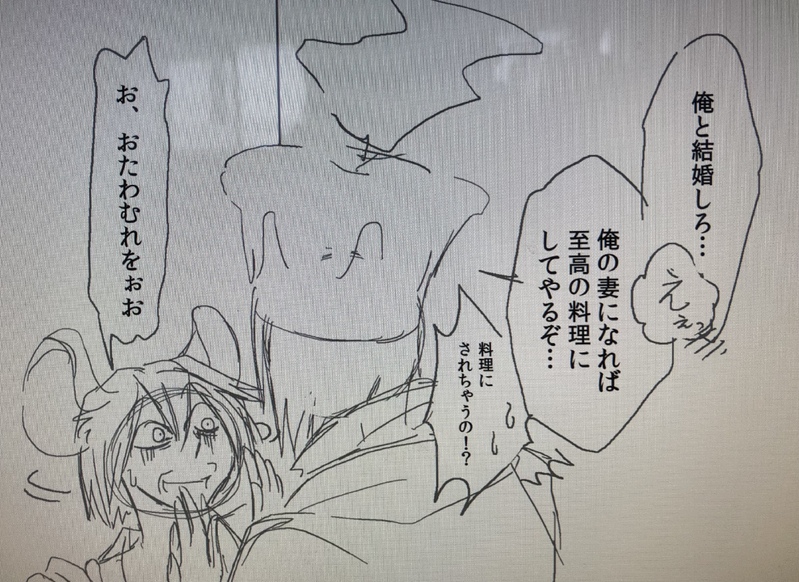 miraimaru☆quiet followMAIKING以前結婚妄想で考えていたやつです。『青髭』とか『ミノタウロス』みたいに、嫁いだらデッドエンドみたいな…。そんなにグレさんに懐いてんならいっそ結婚しろ的な誰かの冗談を真に受けたシェフみたいなみたいな。 #シェフグレ chefgre Tap to full screen (size:3792x2762).Repost is prohibited Let's send reactions! freqpopularsnackothersPayment processing Replies from the creator Follow creator you care about!☆quiet follow miraimaruPROGRESSクリパスと洒落怖のカプinグレホテル妄想。 2 miraimaruPROGRESS従兄弟組のデリバリーコントネタ…。我が家妄想のタクシーとフォンは酔っ払うと悪ノリ仲良しになります。 3 miraimaruPROGRESSミラキャサ04ミラキャサ03の数日後妄想ですが多忙によりこれ以上進まず。冒頭に出てくる女性ゲストさんはpixivにあげてる小説で少し語られた、ミラーに興味を持たれた末監禁され魂をくわれ、干からびの末路を辿った方です。 4 miraimaruPROGRESSミラキャサ03ミラキャサ02の続きです。後半タクキャサ事後。タクシーさん一時的に振られました。タクシーさんは割とキャサリン好きなんだけどお互い束縛は不要と思っている節があります。という妄想です。ひとまず一区切りとして下書き完成です。 6 miraimaruPROGRESSミラキャサ02ミラキャサ01の続きです。我が家妄想だと、キャサリンと仲良くするには血液を供物として捧げないと致す前に干からびてデッドエンドな様です。 6 miraimaruPROGRESSミラキャサ01長編です。割と気に入ってるのですが忙しくて完成しません。 7 related works miraimaruMAIKING以前結婚妄想で考えていたやつです。『青髭』とか『ミノタウロス』みたいに、嫁いだらデッドエンドみたいな…。そんなにグレさんに懐いてんならいっそ結婚しろ的な誰かの冗談を真に受けたシェフみたいなみたいな。 recommended works miraimaruPASTこれ描いた当初はジェラシー飲まされてる妄想だったけど、小説での妄想グレガによりオリジナルカクテル『欲望』で、グレさんにお持ち帰り寸前なガールちゃんでも良きになった。🌸(グレゴリーさんイメージのカクテル尊い…♡)🐭(これで貴女は私のもの…になってくれたら嬉しいんですがねぇ…さぁ私の部屋に行きましょうね) miraimaruPASTこれをいつか今の妄想状態で描いてみたいです。きっと色々変わってる→ネズ🌸これ前にもありましたね。🐭なつかしいですなぁ。ネズ🌸…前ほど恥ずかしさというか…嫌じゃないです。🐭ほほぅ。ではもう少し仲良くしましょう♡(服の中触り始める)ネズ🌸外にジェームスくんがいて聞いてるからダメです(つねり)🐭痛い痛い痛いみたいな。みたいな。 miraimaruPAST回を追うごとにグレさんの方が余裕なくなってくグレガ妄想になってるの我ながら良き。 8 miraimaruDOODLEトレインちゃんまとめ。小説妄想登場時は列車語(プシュープシュンシュン)しか喋れなかったけど、スピード達の妹分になる代わりにダック兄弟から新しい声帯機能を搭載してもらい、今は人語を話せます。読み書きはデッドさんから習い中。車掌に片思いしてるけど、実らなさそう。スピードレッドから告られて保留中。という妄想。昔はもっと高身長だったらしいけど、今は魂をレプリカに移しているため小さいのです。 11 miraimaruDOODLEダンスさせたくて描いていた続かない落書きです。ミラガとキャサシェフで社交ダンス妄想。 2 北野さんDOODLE♨️の日って事っ再放送玄実です!!!!!! 5 rie_ilvDOODLE 12 IDKDOODLEref 🎬 mug☕️DOODLE線も整えてないrkgk🕒、🐬、☾さん 3