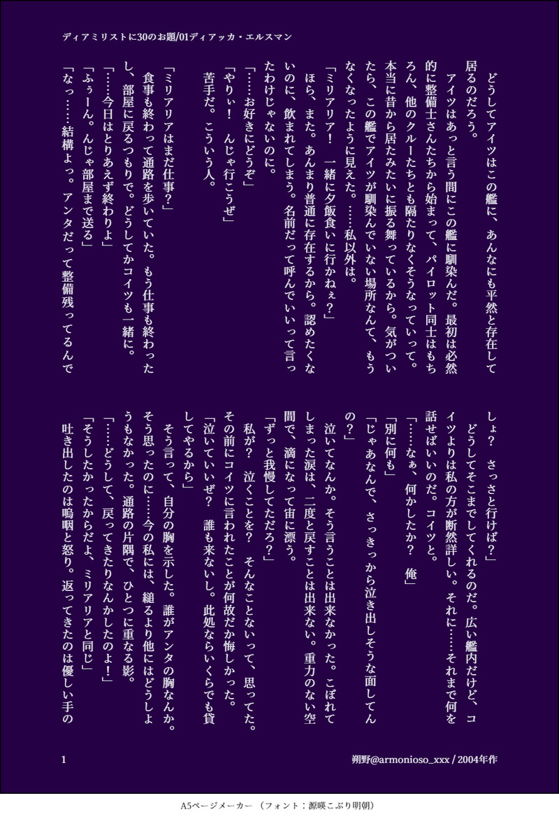 朔野@armonioso_xxx☆quiet followPAST過去作ディアミリ(全12枚)2004年当時の作品をサルベージしてしまい、以前Xにも試しに上げてみたものを移しました。ちょっと…いや、だいぶ恥なんですけど、なにせ20年前の作文なのでね…薄目でどうぞ(震) #ディアミリ show all(+11 images) Tap to full screen (size:888x1300).Repost is prohibited Let's send reactions! freqpopularsnackothersPayment processing Replies from the creator Follow creator you care about!☆quiet follow 朔野@armonioso_xxxSPOILERGジェネET/SEED Recollectionネタバレ感想ストーリーを脇目に置いて、たった数秒の新規カットがあったディアッカと、それに付随したディアミリ妄想のみの“超絶個人的な”感想に振り切ってますがよろしければどうぞ。 2138 朔野@armonioso_xxxMOURNING【ディアミリ過去世パロ/死ネタ注意】約一年ほど前にXでフォロワーさんと、ディアミリの転生パロの話で盛り上がっていた時に書いた支離滅裂な妄想文です。一度ふせったーか何かで投下したんですが探すのが大変なので、こちらに再アップ。小説ではありません。どっちかというとプロットです。形にする機会はしばらく無いので供養を兼ねて投下します。 3640 朔野@armonioso_xxxSPUR MEディアミリ本2冊目R18シーン冒頭サンプル(2025年2月種インパクト発行予定)修羅場の様相を呈してきたので、再び尻叩きのために投下します。書き上がったばかりの第一稿のため、校正後に修正がかかる可能性大です。どうかケツを叩いてやってください…!!PASS:18歳以上? yse or no 5 朔野@armonioso_xxxSPUR MEディアミリ本2冊目冒頭サンプル(2025年2月種インパクト発行予定)完全に自分の尻叩きのためだけに投下。締切が迫ってきてるので早めに対処。最後まで書き上がったら別途、R18部分のサンプルも上げます。 2 朔野@armonioso_xxxSPOILER航海日誌で判明した「ジャーナリスト時代のミリアリアがターミナルに所属していた」辺りの、完全に個人的な俺得でしかない考察まとめ。暇でどうしようもない人向け。もちろん異論は認める。 2248 朔野@armonioso_xxxSPOILER『ノイマンの航海日誌』ネタバレ脳直感想。ディアミリのことしか語っていません。 3503 related works tsukiha0240DOODLEそういや昨日のディアミリ絵茶は2つ描きました。1/2がディアミリじゃないの…お前、そういうところだぞ本当…(前回の絵茶で描いたのは保存し忘れたし、何描いたか思い出せないポンコツ😇)(その時もディアミリじゃないやつの方が多かった気がする😇) かわなDONE種・停戦直後の二人の話 4994 momokei312DOODLEディアミリぬるい肌注意 髪おろしミリィの初めてはディアだと私は思っているトールとはプラトニックのままがいいです にほ。MOURNINGシンルナ(+ディアミリ)のルナとディのみ。ルナとディが喋ってるだけ。何この組み合わせ?って感じですが自分に配慮した結果です。そして初めてのシンルナ🌈創作。多分運命のあと、多分ぜろの前。(適当)シンルナとディは運命後に何度か接点あったという設定。ディアミリの状況はよくわかりませんが、ディは全く別れたつもりないというマインドです。細かいことは目をつぶってください。 4645 朔野@armonioso_xxxSPUR MEディアミリ本1冊目R18シーンサンプル(2025年2月種インパクト発行予定)書き上がったらと言っておきながら、再び尻叩きのために投下します。時期的なものでないどころか、真逆の季節感で申し訳ない。PASS:18歳以上? yse or no 2 にほ。MOURNINGプラントへ来いの妄想。ディアミリ。ミリはプラント来いと言われて愚痴っぽくぶーぶー言ってましたが、実際はちょっと湿っぽいやり取りしててもいーなーと思ったりして出来た産物。一応処女作。 2511 朔野@armonioso_xxxPAST過去作ディアミリ(全12枚)2004年当時の作品をサルベージしてしまい、以前Xにも試しに上げてみたものを移しました。ちょっと…いや、だいぶ恥なんですけど、なにせ20年前の作文なのでね…薄目でどうぞ(震) 12 かわなDONEオーブ軍人としてプラントに出向しているミリアリアとイザークの話。ディアミリ 3094 朔野@armonioso_xxxSPUR MEディアミリ本1冊目冒頭サンプル(2025年2月種インパクト発行予定)完全に自分の尻叩きのためだけに投下。最後まで書き上がったら別途、R18部分のサンプルも上げます。 2 recommended works mainichinemuichDONE相互さんのツイートがあまりに解釈一致だったのでネタをお借りしました。※ご本人に掲載許可いただいています!ありがとうございます!※すけべはありません!ギャグです!弊イデアズにおいても性欲は🐙の方が溜めがち(小出しの発散方法が分からない)だと思っているので、「🐙ちゃんは爆発力がすごくて、スイッチ入ったら野生が目覚めてしまい大変そう」という呟きに飛びついちゃいましたね。(そうですか) 2 momokei312DOODLEディアミリぬるい肌注意 髪おろしミリィの初めてはディアだと私は思っているトールとはプラトニックのままがいいです sagyomidoDONEバスターコクピットックスディアミリ 対面座位18↑ yes or no tsukiha0240DOODLEディアミリ 風邪引いたミリZEROで万が一ミリが出なかったらこういう事で…な妄