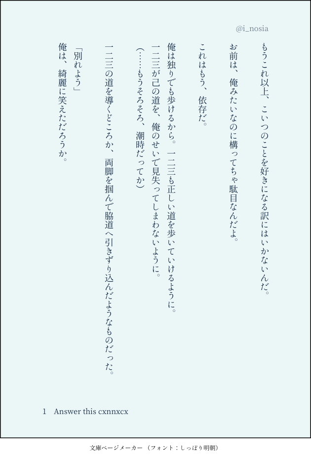 i_nosia☆quiet followMOURNINGだいぶ前に書いたひふどのSS。暗い。とある曲からイメージしました。ほんとは破局から始まるハッピーエンド小説にする予定だったと思うけど、書いた人の主な活動ジャンルが変わってしまったために、いつ続きを書くかわからないので供養。 #ひふど hifudo #ヒ腐マイ hypmic bl #小説 novel #SS ##完成前 show all(+1 images) Tap to full screen (size:630x928).Repost is prohibited Let's send reactions! freqpopularsnackothersPayment processing Replies from the creator Follow creator you care about!☆quiet follow i_nosiaDOODLEちょっと前に描きたい欲が爆発してかいたらくがきみそら(ちょっと暗い)清書の予定がないのであげ今回の作業用BGM「泪」https://open.spotify.com/track/2DmFF0c10xmZp1U4ifx72e?si=q1BZ1HpGSXeAAZh6Z_xexQが空言前半みたいだな〜と聴きながら思ってた i_nosiaPROGRESS線画だけにするつもりでところどころ描き込んじゃったけどやっぱ塗ろうかな 悩 i_nosiaPROGRESS終わりそうで終わらない i_nosiaPROGRESS多分もう3誕当日まであんまり作業時間取れないけど、まだ下書きも終わっていないので進捗だいぶ厳しい i_nosiaMAIKING手と服デザ難航してたけど線画まで漕ぎ着けた!すでに普段の完成時間の2倍以上時間かかってるから早く完成させたい〜 i_nosiaSPOILER⚠️山河令完走推奨⚠️お山ワンドロ練習会 第六座 お題「おめかし」参加させていただきました! +1hでした💦多分、四季山荘の云百周年記念パーティーにお呼ばれした朝、駄々をこねる3歳児に結んであげてた阿絮 2 related works siro1516INFO先程お伝えした「小さな炭治郎くんと義勇さん」からのご挨拶と「お知らせ」を別で投稿です。 4 siro1516TRAINING『小さな子供との夏祭り編』2/2枚 10 かほる(輝海)INFO平成最後にネップリ折本出します。A6サイズ8ページ。R18小説を二本収録。そのうち一つは、ここで公開済みの「路地でもっこりする二人の話」です。コードは29日の夜遅く(30日に日付が変わる頃)に支部で公開します。サンプルで1ページだけチラ見せ。よろしくお願いいたします。 kabolove22DONESSメーカーで作った小説です。 8 文月ちえり&中の人MAIKING作業進捗?みたいな感じの投稿だけど、現在Newお仕事に夢中で絶賛放置中な執筆中小説の一つ。第1章の序盤で、サイトにて公開中な10,000文字の約半分相当です。#青春 #小説 #中学生 #オリジナル#自家製本 して書籍化予定です!#文学フリマ #前橋 #東京 #文フリ 出店予定 14 zeppei27DONEなんとなく続いている主福のお話で、単品でも読めます。七夕を楽しむ二人と、夏の風物詩たちを詰め込んだお話です。神頼みができない人にも人事を超えた願いがあるのは良いですね。>前作:昔の話https://poipiku.com/271957/11735878.htmlまとめhttps://formicam.ciao.jp/novel/ror.html 3654 ももみつDONEマターさんとクラフターさんの、日常の一コマ話。小説。 9 starareorangedrDONE恭龍の小説(まだつきあってない) 3 かほる(輝海)PROGRESSエアコミアンソロ進捗。やっと攻守交代まで来た(*´艸`*)そして、一番言わせたかったセリフまできた…あぁ満足…まだ終わらないよ(*´ω`*)肝心のセリフに字が重なってる…(´・ω・`)タップすると全部見えるようになります。 recommended works nodahrtTRAININGひふど結婚〜塗りました満足😇#ヒ腐マイ #ひふど かほる(輝海)DONE獠と香を書くかほるさんには「欲しいものほど手に入らない」で始まり、「夢を語る君が眩しかった」がどこかに入って、「この道を信じている」で終わる物語を書いて欲しいです。https://shindanmaker.com/851008奥多摩後ですが、二人の関係はご想像におまかせします。プラトニックでソファでお昼寝をしている香ちゃんかもしれないし、もっこり後で獠の腕の中で眠っている香ちゃんかもしれない。 3 やっぴーDOODLE🎲📚(髪飾りなかった…) かほる(輝海)DONEシティーハンター冴羽獠×槇村香奥多摩後ワードパレット19.天王星綴る/約束/歌声 380 かほる(輝海)DONEシティーハンター槇村香×冴羽獠原作以上の関係あなたはかほるさんちのKで【想像してた? / ごくり】をお題にして140字SSを書いてください。#shindanmakerhttps://shindanmaker.com/780366たまには嫉妬かおリンを(*´艸`*)もちろん、かおリンは後始末も全部請け負うつもりですよ(*´艸`*) 149 あかぎ(利便事屋のすがた)DONE初詣SS、続きましては天晴√です。今回はちと難航して、幾度か下書きを書き直しましたがどうにか完成。現時点じゃすっかりお正月ムードは影も形もありませんが(滝汗)、今回も初詣デート気分を味わえれば幸いです。残るはあと二人。がんばって全√コンプリートするぞー! 1411 かほる(輝海)DONEシティーハンター冴羽獠×槇村香原作以上の関係あなたはかほるさんちのKで【待てない / 夢中になるから】をお題にして140字SSを書いてください。#shindanmakerhttps://shindanmaker.com/780366すっかり絆されちゃって…(´;ω;`)ウッ… 149 まぐろのゆっけDOODLE銃二ワンドロ「誕生日」向きが狂ってるのは見逃してください 2 auk_pDONE上げ損ねてたらくがき