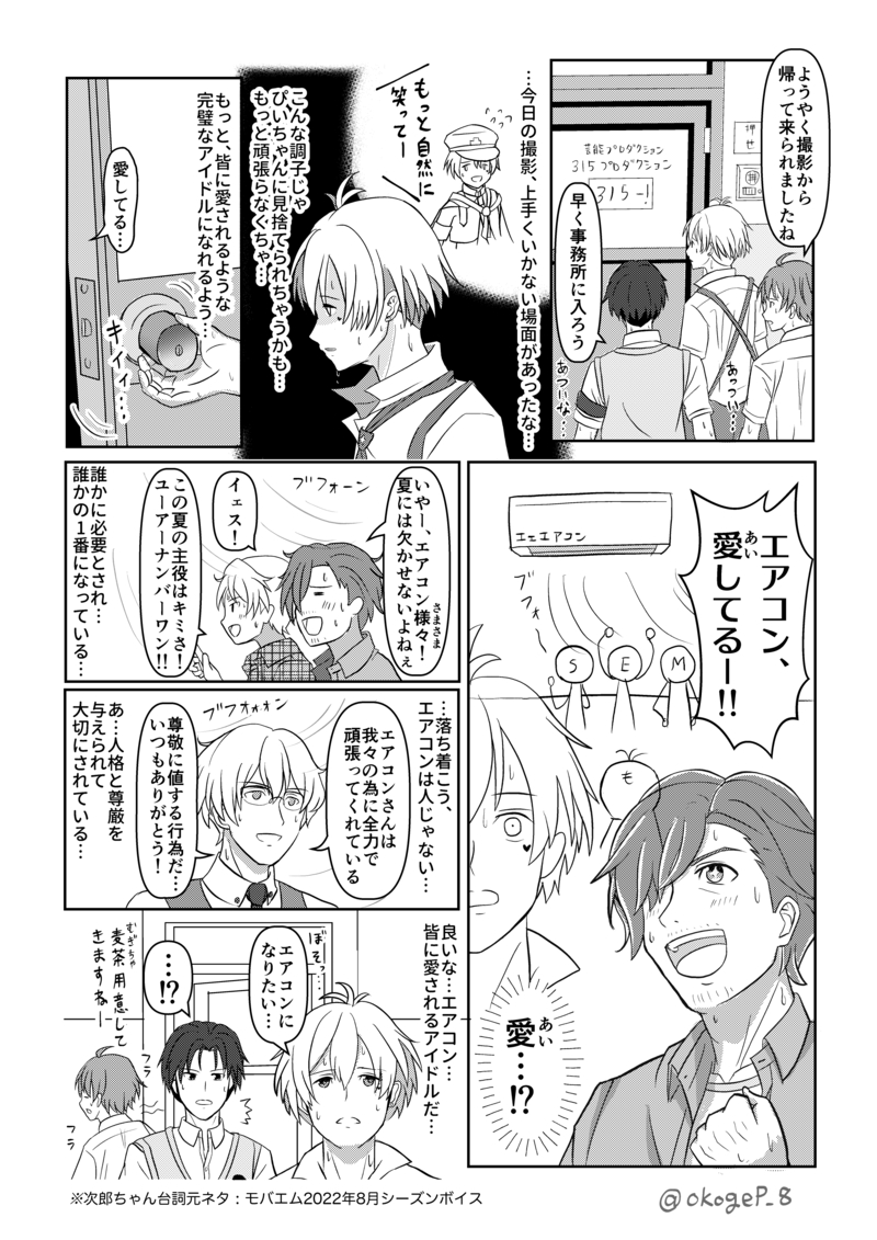 okogeP_8☆quiet followDONE【漫画】暑さに疲れた百々人と、愛と感謝を叫ぶS.E.Mの漫画です。全員暑さで疲れてます。 #SideM show all(+1 images) Tap to full screen (size:2480x3508).Repost is prohibited Let's send reactions! freqpopularsnackothersPayment processing Replies from the creator Follow creator you care about!☆quiet follow okogeP_8DONE某都市伝説を解体するアレのパロディシリーズ、C.FIRSTセンターの天峰 秀が活躍するストーリーです。元ネタの大きなネタバレは無い&元ネタが分からなくても大丈夫なように作っていますが、少しでも気になる方は ご注意くださいませ。一応の全体ストーリーは考えているので、少しずつ追加していく感じでいく予定です。(最終更新:2015/10/19 NoriNoriTalk編を追加) 28 okogeP_8DONE(漫画)パバステや新刊のおまけペーパーに付けていた漫画です。振り付けのポーズの一部が「番組のお便りの宛先はコチラ!」的なやつに見えなくもないよな…って発想だけで描きました。 okogeP_8MENU【8/30 パバステ現地4th】お品書き8/30 Passion! VIRTU@L STAGE!現地4th in多摩【や28】焼きたて おこげ本舗パバステ4thのお品書きです。新刊の他、特典ポストカードやグッズなども用意しております。良ければお立ち寄りくださると嬉しいです!新刊のサンプルはこちら↓https://poipiku.com/5392936/12115233.html 2 okogeP_8INFO【パバステ現地4th】新刊サンプル『サイコーひとくちアラカルト』全年齢/A5/本文70p/CPなし/800円(会場頒布価格)8/30 Passion! VIRTU@L STAGE!現地4th in多摩にて頒布予定。315プロオールスター(49人+α)のひとくちサイズ漫画の詰め合わせ本です。49人それぞれが主役の1P漫画の他描きおろしや未公開作品なども多数収録。※後日通販予定 8 okogeP_8DOODLEクラファ最新ストーリーで、例の質問に対する反応が三者三様で良かったなーって思った勢いで描いたやつです。それはそれとして、Pは何であんなにハッチャケてたんだよ… 2 okogeP_8DONE鋭心先輩が応援団衣装のアレについてWhyな疑問を抱くお話を描きました。H◯Vコラボネタ。あのデザイン可愛いくて大好きなんですが、本人的には「???」な状態になってそうだなと思ったので… 3 related works ユキニョDONEクリスマス前半戦お疲れ様でした~ うしおDOODLE締まったタイを緩める~ のフレーズが頭から離れなくなったので描きました つくね子PAST ユキニョDONEクリスマス前半戦お疲れ様でした~ ご飯ヶ竹吾郎DONEpkmnのエリトレの服 ぽーらDOODLEねむる翼mini NRGayaDOODLEコキュートス🤔 ご飯ヶ竹吾郎DONEカラーパレットでリクいただいたもの ねねこDOODLE #SideMせいじちゅん……