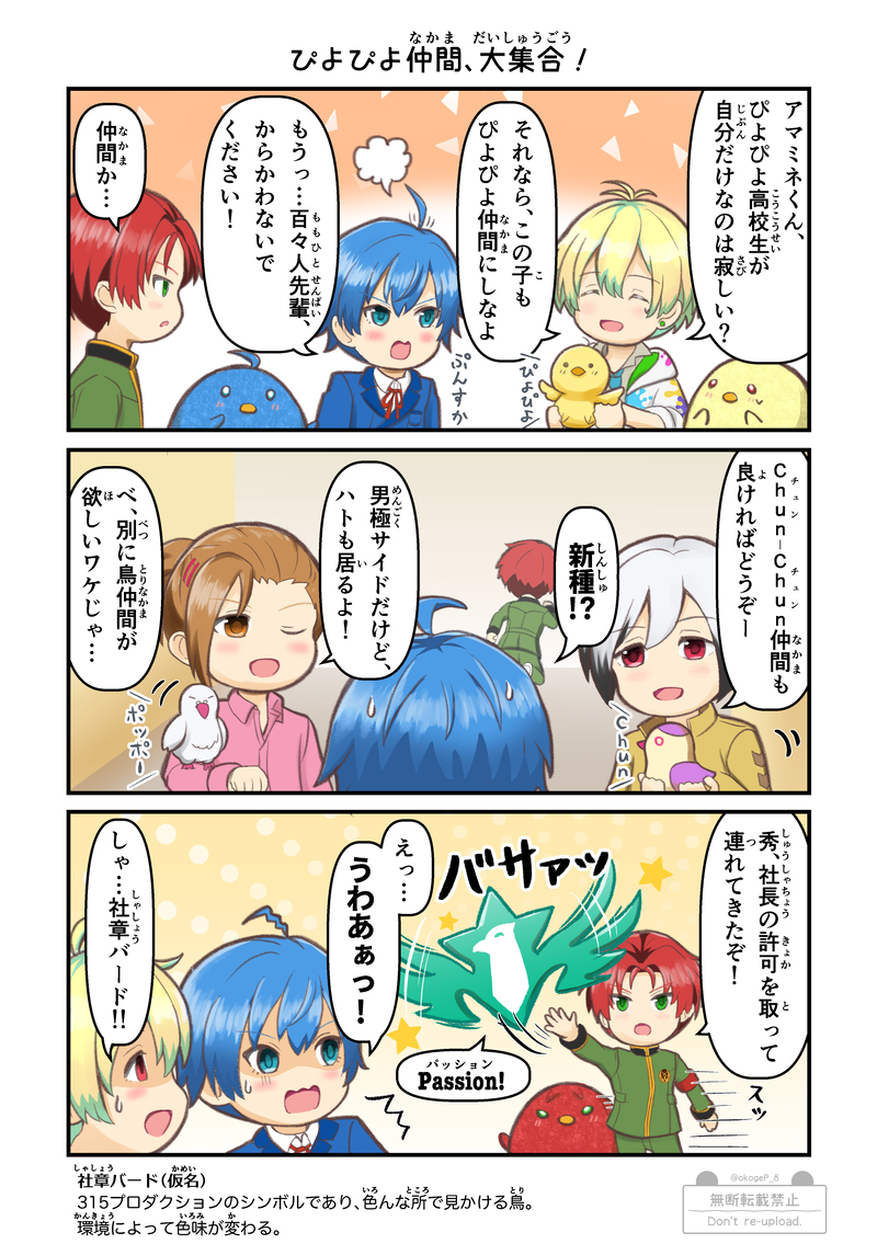 okogeP_8☆quiet followDONE【漫画】ちっちゃいクラファ漫画。ぴよぴよ高校生のために、ぴよぴよ言ったり言わなかったりする愉快な仲間たちが大集合するお話です。登場するバードたちの鳴き声はあくまでイメージとなり、実際の鳴き声と異なるかと思われます。 #SideM Tap to full screen (size:1748x2480).Repost is prohibited Let's send reactions! freqpopularsnackothersPayment processing Replies from the creator Follow creator you care about!☆quiet follow okogeP_8DONE某都市伝説を解体するアレのパロディシリーズ、C.FIRSTセンターの天峰 秀が活躍するストーリーです。元ネタの大きなネタバレは無い&元ネタが分からなくても大丈夫なように作っていますが、少しでも気になる方は ご注意くださいませ。一応の全体ストーリーは考えているので、少しずつ追加していく感じでいく予定です。(最終更新:2015/10/19 NoriNoriTalk編を追加) 28 okogeP_8DONE(漫画)パバステや新刊のおまけペーパーに付けていた漫画です。振り付けのポーズの一部が「番組のお便りの宛先はコチラ!」的なやつに見えなくもないよな…って発想だけで描きました。 okogeP_8MENU【8/30 パバステ現地4th】お品書き8/30 Passion! VIRTU@L STAGE!現地4th in多摩【や28】焼きたて おこげ本舗パバステ4thのお品書きです。新刊の他、特典ポストカードやグッズなども用意しております。良ければお立ち寄りくださると嬉しいです!新刊のサンプルはこちら↓https://poipiku.com/5392936/12115233.html 2 okogeP_8INFO【パバステ現地4th】新刊サンプル『サイコーひとくちアラカルト』全年齢/A5/本文70p/CPなし/800円(会場頒布価格)8/30 Passion! VIRTU@L STAGE!現地4th in多摩にて頒布予定。315プロオールスター(49人+α)のひとくちサイズ漫画の詰め合わせ本です。49人それぞれが主役の1P漫画の他描きおろしや未公開作品なども多数収録。※後日通販予定 8 okogeP_8DOODLEクラファ最新ストーリーで、例の質問に対する反応が三者三様で良かったなーって思った勢いで描いたやつです。それはそれとして、Pは何であんなにハッチャケてたんだよ… 2 okogeP_8DONE鋭心先輩が応援団衣装のアレについてWhyな疑問を抱くお話を描きました。H◯Vコラボネタ。あのデザイン可愛いくて大好きなんですが、本人的には「???」な状態になってそうだなと思ったので… 3 related works ご飯ヶ竹吾郎DONEカラーパレットでリクいただいたもの ねねこDOODLE #SideMせいじちゅん…… ぽーらDOODLEねむる翼mini NRGayaDOODLEコキュートス🤔 ご飯ヶ竹吾郎DONEpkmnのエリトレの服 ユキニョDONEクリスマス前半戦お疲れ様でした~ うしおDOODLE締まったタイを緩める~ のフレーズが頭から離れなくなったので描きました つくね子PAST ユキニョDONEクリスマス前半戦お疲れ様でした~ recommended works うしおDONE翔太くん!で最後の一人でした~5月からくじで引いた順に描いててやっと全員!描けた!やったー! 2 Nicole_17450DONE2018描き納めの咲ちゃん @真次PAST2018年の類誕生日イラスト。キラキラペンやシールでデコりました。 つくね子PAST アレクサンダー勇輝DOODLE鷹城恭二は成人済みロリなのでものを食べると口の周りが食べカスだらけになる#SideM みつたDOODLEリプ来た絵文字かくやつ英雄っ aaaDOODLE #SideM途中で力尽きた ぽーらDOODLEステの🎈ぷっぷく薫さんがかわいかったから ymzw_skDOODLE「プロデューサーさんって意外とさぁ…」