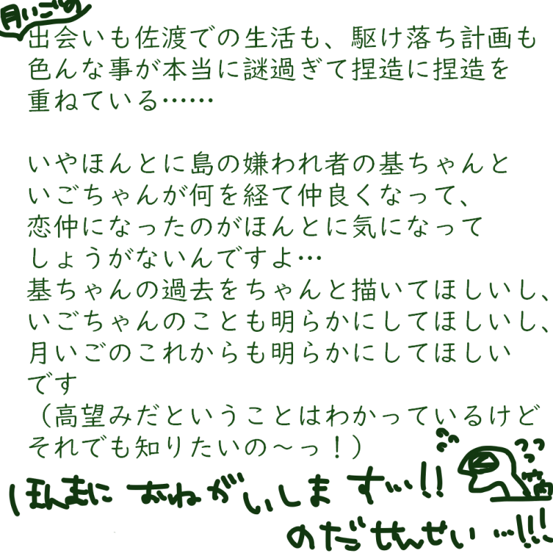 はなもり☆quiet followMOURNING「おめの世界おれの世界」の最後のページ書いたけど月いごのことを考えるほどわからなくなっていくので、ほんとに…明らかにしてほしいです(;;)本当にお願いします(土下座)月いごが気になってしょうがないですッッ~~!!!! ##あとがき Tap to full screen (size:1000x1000).Repost is prohibited Let's send reactions! freqpopularsnackothersPayment processing Replies from the creator Follow creator you care about!☆quiet follow はなもりDOODLE はなもりDOODLEこわいやさん おもしろすぎ。続きが気になる。ジャンプラで連載してますのでよろしければ~~~☞https://shonenjumpplus.com/episode/17106567264478575623 はなもりDOODLE妖刀契約者の一人、お寿司おじさんの妄想です。2枚目は文字無verです。 2 はなもりDOODLE久しぶりに当主ペア描いたけど、当主ペア良~☻ はなもりDOODLE猫に似てる…かもしれない はなもりDOODLE相変わらず漆羽さんの服がわからん…単行本で解説あると嬉しいな~ recommended works ひらびPAST #ゴールデンカムイ suminohudePASTネタはコピペbotさんより 広瀬こずえDOODLE 83101414DONE 眞神 依砂DONEグラクロキング難しいけど愛で頑張た きゅうり/木瓜DOODLE リイチMAIKING3人組再会した喜びポーズ(ルーティン)の参考元はrabさんです サントスTRAININGてーきゅうでゴールデンカムイのラッコ鍋パロです。コマ等適宜省いています。 3 cercaconunamoogMOURNING師団の花は芥子の花
