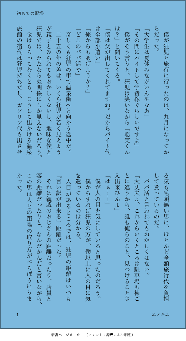 esukiyu3☆quiet followPAST去年……お礼にアップしたのですが、リンクを間違えるという痛恨のミスを犯した作品です。暇つぶしにどうぞ…… show all(+7 images) Tap to full screen (size:618x1132).Repost is prohibited Let's send reactions! freqpopularsnackothersPayment processing Replies from the creator Follow creator you care about!☆quiet follow esukiyu3PROGRESS7月マ!5発行予定の、モブ視点全年齢の書き下ろし部分の草案です(大幅に加筆修正あるはず)。タイトル『名前のない僕はいない』全年齢マロでお題くださった方、ありがとうございますね! 再録予定は↓・縁の器/僕の強運/キラキラの一等星/僕の作り手/ヒガンで多分200p前後です。各話の間に、狂児さんの家の鏡に住む幽霊視点の話が挟みこみます。 3219 esukiyu3PAST去年……お礼にアップしたのですが、リンクを間違えるという痛恨のミスを犯した作品です。暇つぶしにどうぞ…… 8 esukiyu3DONE大変遅くなって失礼しました。「今日も鶴は夜に歌う」の前日譚です。 8 esukiyu3DONEワンライです。きょさと前提の元塾講師とさと実くんの会話です。R15レベルの単語がでてきます。 5 esukiyu3DONEワンライです。一発書きなので、誤字脱字意味不明本当にお許しください。ネタはまとまっていたのに、力不足でした……ごめんなさい! 5169 esukiyu3MOURNING妄想の6.5話です!続きはhttps://www.pixiv.net/novel/show.php?id=19148338 になります。 2675 recommended works サトちぅDOODLE本日のお絵描き。最後2枚はスケベ注意。 5 jyagaxgPASTぷらいべったーに載せてたアズイル妄想絵です!※濃厚ミルクで仔ウサギ育成中🐰💕 寝太郎DOODLE※年齢操作※捏造※聡実くんがヤ最初仲悪いけどこの後マブになる、そういうやつです MahiroDOODLE と、、んは。ちDONEまなんちょWebオンリー開催おめでとうございます❣️不安なのでこちらでもピクスペと同じものを展示してます。ネップリも。見やすい方で見ていただけたらうれしいです。 7 sataneseMDONE总而言之是第一次尝试的四爱,写得各种意义上水平不高不下,也许会二修密码:18↑?(yes/no) 6857 shirasu_grbrDOODLE付き合ってないグラシスのグランが仮面奪うくらいの気持ちでシスの耳を触らせてもらったら大変なことになった話 11 Iyokan_AzumaruDONEお題箱よりアキバズトリップ2の誰でもできるテレキネシス(操られて恥ずかしがりながらも自らの手でスカートを脱いで、がに股でパンツを見せびらかさせられる)を受ける閃乱カグラの雪不帰 2 林(ハヤシ)TRAINING30年後読切ドラロナ読ドが特定のワードを口にするとイくようになった読ロ様です!!!!!!挿ってないからセーフ!15↑?y/n開催おめでとうございます #30年後ドロ祭り 1313