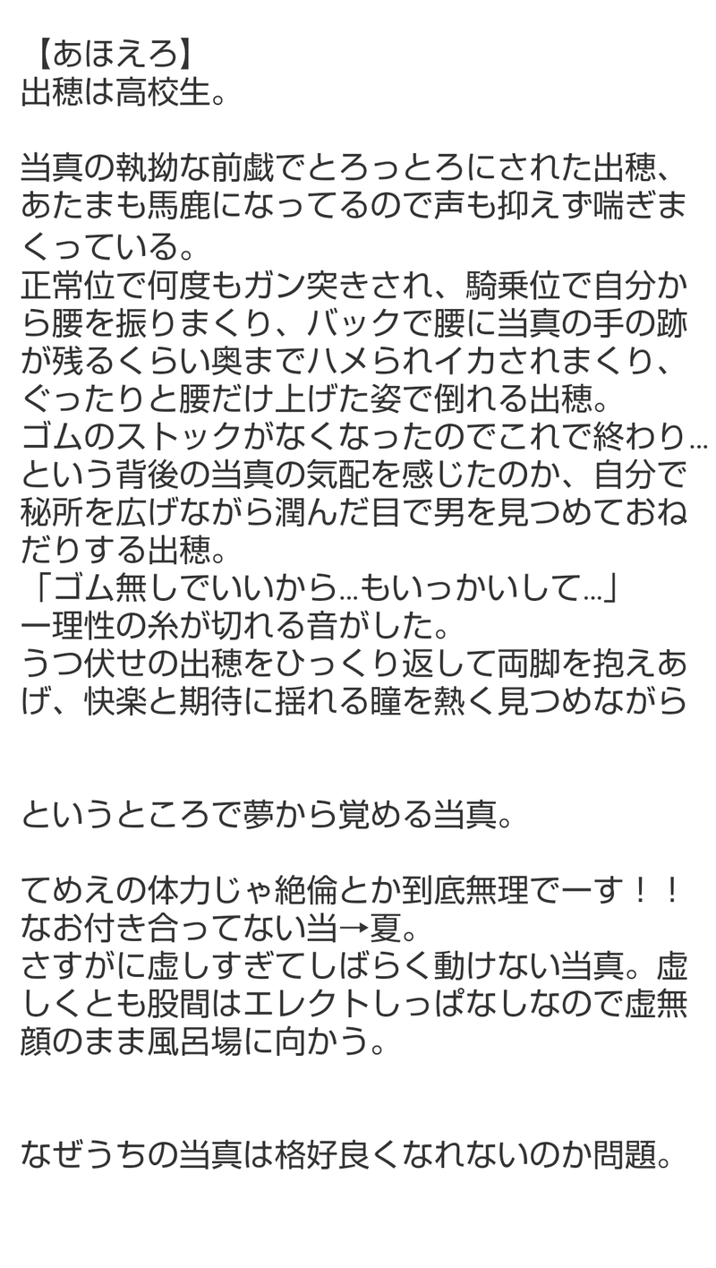 Kasho_7hktk☆quiet followMEMO暑いせいか当夏に飢えてるせいか妄想が過激になってしまう今日この頃。あほえろのための画力も文章力もない… #当夏 whenSummer Tap to full screen (size:1080x1912).Repost is prohibited Let's send reactions! freqpopularsnackothersPayment processing Replies from the creator Follow creator you care about!☆quiet follow Kasho_7hktkMEMO最近ずっとえちえち当夏のことを考えているのだが、その流れでなんか突然降ってきた。なんだこれ。 Kasho_7hktkMEMO二人がケンカするシチュを考えてたけど、当真は出穂に甘々すぎるし出穂も基本ポジティブで何かあってもすぐ口にするから理由が思いつかないな…とこねこねしてたらこんなシチュになった。出穂には生理痛もつわりも苦しんで欲しくない民。 Kasho_7hktkMEMO前の猫化ネタのラスト省略したとこずっとこねこねしてたけどなんかうまいこと書けないのでここで諦めた。ほんとは真ん中バースデーにアップしたかったのに…恋人になったら当真に甘い台詞ダダ漏らししてほしい民。 Kasho_7hktkMEMO出穂ちゃんお誕生日になんの準備もできてなくてせめて何か…!と雑メモをアップ。それでも日付変わってしまった…出穂ちゃん、これからの成長を楽しみにしています🪅🎂🎉👏 Kasho_7hktkMEMOひとつ前の🔞とは別の世界線の一幕。我が設定では高卒時に出穂が記憶封印対象になる遠恋世界線と、我慢できずに高3出穂に手を出しちゃうずっと一緒世界線があってぇ… Kasho_7hktkMEMOここんとこずっと妄想してたネタ。我ながら妄想期間が長くてきもい。寄る年波でそこそこえろ小説は読んできてたんだが、いざ己が表現しようとすると全然語彙力ないな…修行が足りない… 2 related works Kasho_7hktkMEMO暑いせいか当夏に飢えてるせいか妄想が過激になってしまう今日この頃。あほえろのための画力も文章力もない… Kasho_7hktkMEMO脳内ではほぼ毎日こねこねしてるんだけど、メモすら捗らず…そんなわけで昔のメモを。これでも当夏強火なんです信じてください! Kasho_7hktkMEMO最後のやり取りとお姉様方のセリフを言わせたかっただけなのになぜこんなに長くなったのか。よい台詞が浮かばないし、不快になる人が多そうなのでこちらに置いとく。 4 Kasho_7hktkREHABILIこの使い方合ってるのかしらん。駄目なら消します。今回の帰省の理由の半分くらい。サッカー負けたので心のリハビリ。パネルが等身大じゃなかったのが残念。 Kasho_7hktkMEMO支部の話のちょっと続き。漫画描けるようになりたいと思いつつ何もしてない。ホワイトデーにあげようかと思っていたが仕事で疲れててえっちい当夏のことばかり頭に浮かぶので先に出しておく。 Kasho_7hktkDOODLE当夏にいちゃいちゃしててほしすぎる欲が天元突破している。しかし長いこと絵を描いていなかったら下手すぎて…これ以上こねくり回してもどうにもならないから諦めた。デジタル絵チャレンジしたいが何もわからない&宝の持ち腐れになりそう。 2 Kasho_7hktkMEMO当夏が見たすぎて過激派になってきた。かもしれない。 Kasho_7hktkMEMOなんか妄想が降ってきたので勢いでメモった。なぜ降ってきたのかというと、おそらくおっさんずラブ続編の報が出たから…🎆 Kasho_7hktkDOODLEバニー尽くしの日と聞いたので。バニー衣装はもっと肉付きのよい方が似合うのだけどまあそれはそれ。これ当夏か? recommended works hatotootoDONEドルパロ🔗🔮の続き、🌊視点。巻き込まれる🌊 スーキとびおり好きな人しか読んではいけないやつです。相変わらず低解像度。 1573 Shirase_WDOODLE5月もいろいろありましたね 29 BeiQiDOODLE汉澈,只是在接吻呢 steuww有夼DOODLE11.2朔间零生日快乐——!!内含咬,注意以上!共18p,阅读顺序从右至左 19 hisayoshi_TRAININGファンアート fumi乃DONE💛💜Privatterに投稿した『わからせハロウィン🎃 💛💜(マフィア×吸血鬼)🔞』に追加したイラスト1枚とオマケです↓↓ https://privatter.net/p/11327340【pass】誕生日4桁+英字3字(My Birthday+3 famous alphabet letters[7letters])2025.01.10 3 lalala_ray_888INFO* 1/12(日) SUPER RTS!! コピー本サンプル *・R18・表紙込み計8p・アカッシケジがふたなり(両性具有)です。・一見♂ですが下半身に♀もあります。・最初からおっぱじまてる上に全ページエッヂしかしてません!pass:18↑?y/n 7 atmgpd93DOODLECoC【VOID】PC/PL早咲 望/コトリさん明希/にかさん日高 暁/立花紫月さんラウム/はむちゃ touya_525DONEgta3救急と鴉の転生if(学パロ)#1です。本当に好き勝手妄想してるだけなので寛大な心でよろしくお願いします。⚠️何でも許せる方向け⚠️※ご本人さまと無関係です。別世界のキャラクターとしてご覧ください。パスは2人の数字を足した数。 2