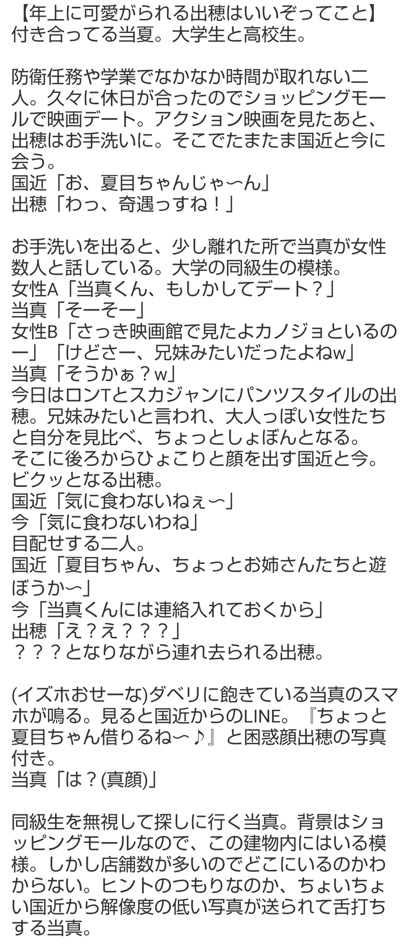Kasho_7hktk☆quiet followMEMO頑張れば小説にできるかもと思ったが、ファッション知識ゼロで服の種類も素材もブランドも表現できる言葉を持たないので諦めた。 #当夏 whenSummer show all(+1 images) Tap to full screen (size:1080x2547).Repost is prohibited Let's send reactions! freqpopularsnackothersPayment processing Replies from the creator Follow creator you care about!☆quiet follow Kasho_7hktkMEMO最近ずっとえちえち当夏のことを考えているのだが、その流れでなんか突然降ってきた。なんだこれ。 Kasho_7hktkMEMO二人がケンカするシチュを考えてたけど、当真は出穂に甘々すぎるし出穂も基本ポジティブで何かあってもすぐ口にするから理由が思いつかないな…とこねこねしてたらこんなシチュになった。出穂には生理痛もつわりも苦しんで欲しくない民。 Kasho_7hktkMEMO前の猫化ネタのラスト省略したとこずっとこねこねしてたけどなんかうまいこと書けないのでここで諦めた。ほんとは真ん中バースデーにアップしたかったのに…恋人になったら当真に甘い台詞ダダ漏らししてほしい民。 Kasho_7hktkMEMO出穂ちゃんお誕生日になんの準備もできてなくてせめて何か…!と雑メモをアップ。それでも日付変わってしまった…出穂ちゃん、これからの成長を楽しみにしています🪅🎂🎉👏 Kasho_7hktkMEMOひとつ前の🔞とは別の世界線の一幕。我が設定では高卒時に出穂が記憶封印対象になる遠恋世界線と、我慢できずに高3出穂に手を出しちゃうずっと一緒世界線があってぇ… Kasho_7hktkMEMOここんとこずっと妄想してたネタ。我ながら妄想期間が長くてきもい。寄る年波でそこそこえろ小説は読んできてたんだが、いざ己が表現しようとすると全然語彙力ないな…修行が足りない… 2 related works Kasho_7hktkMEMO最後のやり取りとお姉様方のセリフを言わせたかっただけなのになぜこんなに長くなったのか。よい台詞が浮かばないし、不快になる人が多そうなのでこちらに置いとく。 4 Kasho_7hktkDOODLE当夏にいちゃいちゃしててほしすぎる欲が天元突破している。しかし長いこと絵を描いていなかったら下手すぎて…これ以上こねくり回してもどうにもならないから諦めた。デジタル絵チャレンジしたいが何もわからない&宝の持ち腐れになりそう。 2 Kasho_7hktkMEMO支部の話のちょっと続き。漫画描けるようになりたいと思いつつ何もしてない。ホワイトデーにあげようかと思っていたが仕事で疲れててえっちい当夏のことばかり頭に浮かぶので先に出しておく。 Kasho_7hktkREHABILIこの使い方合ってるのかしらん。駄目なら消します。今回の帰省の理由の半分くらい。サッカー負けたので心のリハビリ。パネルが等身大じゃなかったのが残念。 Kasho_7hktkMEMO脳内ではほぼ毎日こねこねしてるんだけど、メモすら捗らず…そんなわけで昔のメモを。これでも当夏強火なんです信じてください! Kasho_7hktkMEMOなんか妄想が降ってきたので勢いでメモった。なぜ降ってきたのかというと、おそらくおっさんずラブ続編の報が出たから…🎆 Kasho_7hktkMEMO当夏が見たすぎて過激派になってきた。かもしれない。 Kasho_7hktkMEMO暑いせいか当夏に飢えてるせいか妄想が過激になってしまう今日この頃。あほえろのための画力も文章力もない… Kasho_7hktkDOODLEバニー尽くしの日と聞いたので。バニー衣装はもっと肉付きのよい方が似合うのだけどまあそれはそれ。これ当夏か? recommended works fukamm3116PROGRESS前に上げた当真誕生日話の後日談で各方面(荒船哲次の場合、那須隊の場合、夏目出穂の場合、当真勇の場合、冬島隊の場合)を書こうとしていてふと思いついたので東春秋の場合をメモしたら意外といい感じになったので自己満の為に載せます(長い)あくまでメモ段階なので文脈は繋がってません、雰囲気 475 bzzz171DOODLE我用我的青春见证了你们的双向奔赴。 6 为什么我的碗是空的DOODLE存档(含allss,allsb) 11 po_DONE断っちゃったエの話※イベスト完結前に書いたため違う部分があります 3 セラ🐯INFO2/9 深エジ新刊「カレンダーメモリー」小説サンプル(全18話収録)パス:18⤴︎︎︎? 9 mizuDOODLE 3 SenDOODLE// Gore , guts spilled , cannibalism YeaghPassword: cool 2 komaki_etcDOODLE雨想、成人式リクエスト 2008 SUZUNODOODLEアス主♂アスタルジア調査後の「君との冒険が一番楽しいよ」って台詞大好きなのでそれが描きたかったのに5ページになってしまった!!アス主♂はバルの矢印がめちゃくちゃ大きいのとても良き……アス主♂増えろ…… 5