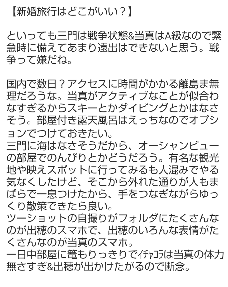 Kasho_7hktk☆quiet followMEMOおっさんずラブの二人のラブラブの供給が多すぎてこちらの消化がおっつかない…出穂がおとなになる頃には新婚旅行、行ける状況だと良いな。 #当夏 whenSummer Tap to full screen (size:1080x1355).Repost is prohibited Let's send reactions! freqpopularsnackothersPayment processing Replies from the creator Follow creator you care about!☆quiet follow Kasho_7hktkMEMO最近ずっとえちえち当夏のことを考えているのだが、その流れでなんか突然降ってきた。なんだこれ。 Kasho_7hktkMEMO二人がケンカするシチュを考えてたけど、当真は出穂に甘々すぎるし出穂も基本ポジティブで何かあってもすぐ口にするから理由が思いつかないな…とこねこねしてたらこんなシチュになった。出穂には生理痛もつわりも苦しんで欲しくない民。 Kasho_7hktkMEMO前の猫化ネタのラスト省略したとこずっとこねこねしてたけどなんかうまいこと書けないのでここで諦めた。ほんとは真ん中バースデーにアップしたかったのに…恋人になったら当真に甘い台詞ダダ漏らししてほしい民。 Kasho_7hktkMEMO出穂ちゃんお誕生日になんの準備もできてなくてせめて何か…!と雑メモをアップ。それでも日付変わってしまった…出穂ちゃん、これからの成長を楽しみにしています🪅🎂🎉👏 Kasho_7hktkMEMOひとつ前の🔞とは別の世界線の一幕。我が設定では高卒時に出穂が記憶封印対象になる遠恋世界線と、我慢できずに高3出穂に手を出しちゃうずっと一緒世界線があってぇ… Kasho_7hktkMEMOここんとこずっと妄想してたネタ。我ながら妄想期間が長くてきもい。寄る年波でそこそこえろ小説は読んできてたんだが、いざ己が表現しようとすると全然語彙力ないな…修行が足りない… 2 related works Kasho_7hktkMEMO最後のやり取りとお姉様方のセリフを言わせたかっただけなのになぜこんなに長くなったのか。よい台詞が浮かばないし、不快になる人が多そうなのでこちらに置いとく。 4 Kasho_7hktkREHABILIこの使い方合ってるのかしらん。駄目なら消します。今回の帰省の理由の半分くらい。サッカー負けたので心のリハビリ。パネルが等身大じゃなかったのが残念。 Kasho_7hktkDOODLEバニー尽くしの日と聞いたので。バニー衣装はもっと肉付きのよい方が似合うのだけどまあそれはそれ。これ当夏か? Kasho_7hktkDOODLE当夏にいちゃいちゃしててほしすぎる欲が天元突破している。しかし長いこと絵を描いていなかったら下手すぎて…これ以上こねくり回してもどうにもならないから諦めた。デジタル絵チャレンジしたいが何もわからない&宝の持ち腐れになりそう。 2 Kasho_7hktkMEMO脳内ではほぼ毎日こねこねしてるんだけど、メモすら捗らず…そんなわけで昔のメモを。これでも当夏強火なんです信じてください! Kasho_7hktkMEMOなんか妄想が降ってきたので勢いでメモった。なぜ降ってきたのかというと、おそらくおっさんずラブ続編の報が出たから…🎆 Kasho_7hktkMEMO暑いせいか当夏に飢えてるせいか妄想が過激になってしまう今日この頃。あほえろのための画力も文章力もない… Kasho_7hktkMEMO当夏が見たすぎて過激派になってきた。かもしれない。 Kasho_7hktkMEMO支部の話のちょっと続き。漫画描けるようになりたいと思いつつ何もしてない。ホワイトデーにあげようかと思っていたが仕事で疲れててえっちい当夏のことばかり頭に浮かぶので先に出しておく。