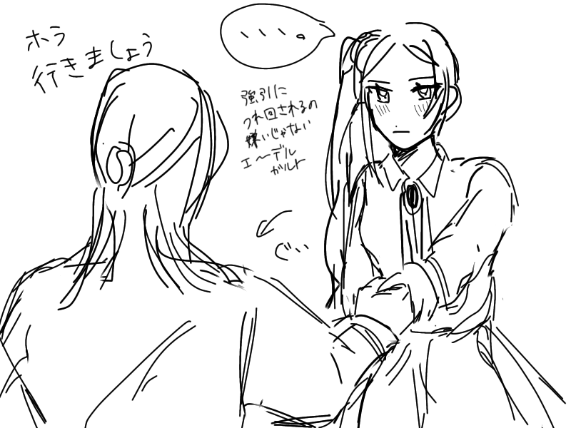 どういう状況でこうなるかというとお茶しに来たのにエーデルちゃんが仕事から離れようとしないとこうなる(と思います) 最初のうちは「ちょっと!勝手に引っ張らないでちょうだい!」とか言いそうだけどそのうち慣れてリンハルトに振り回されるのも悪くないということに気づく 士官学校時代はエーデルちゃんの一方的な世話焼きという感じだったのに今はリンハルトのほうからエーデルちゃんを誘うようになったっていう いいね〜