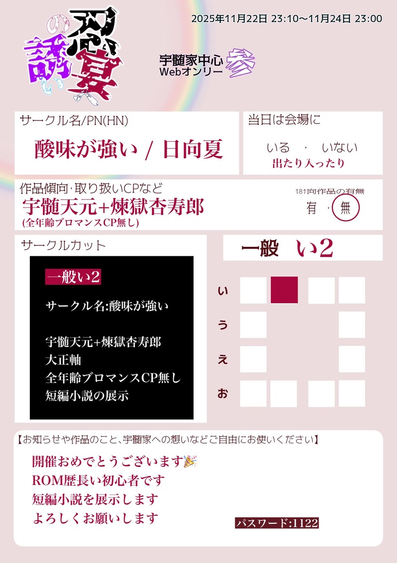 日向夏☆quiet followINFO【イベント】忍宴への誘い【参】一般 い2にてサークル参加します💎+🔥ブロマンス短編小説を展示します全年齢CP無しですよろしくお願いします🙇♀️https://pictsquare.net/y93ykjdek71uape77159srtz8uiwwpao #宇髄天元 uMaruTianyuan #ピクスク pixel #pictSQUARE Tap to full screen (size:1442x2048).Repost is prohibited 日向夏INFO【イベント】忍宴への誘い【参】一般 い2にてサークル参加します💎+🔥ブロマンス短編小説を展示します全年齢CP無しですよろしくお願いします🙇♀️https://pictsquare.net/y93ykjdek71uape77159srtz8uiwwpao related works 氷石涼水INFO2/13 10:00~23:00鳥オンリーイベント 「とりケット」3https://pictsquare.net/zo53d6o0gmo6qw26bb09740b1elcwxam周知されてないんで宣伝失礼します…!💦サークル申し込み受付中です。ハンドメイド、小説、イラスト、漫画、写真などなど作品は色々OKです! 日向夏INFO【イベント】忍宴への誘い【参】一般 い2にてサークル参加します💎+🔥ブロマンス短編小説を展示します全年齢CP無しですよろしくお願いします🙇♀️https://pictsquare.net/y93ykjdek71uape77159srtz8uiwwpao カリドけい/ぴえーる健MENUpictsquareのオンラインイベント「立春〆祭り」にサークル参加します!日時:1月31日(金)21:00~2月1日(土)20:50頒布予定:#ネイバルスターズ・オンライン #はたらくAI! #ポケモンSV #東方Project #レイマリhttps://pictsquare.net/dohsq3jms0g8ys6pp9tm7cg6d4fp2v13 2 えぷとDONE1月14日開催ATLUS作品悪魔メインWEBオンリー #はじめての仲魔召喚 に備えアバター作りましたので無償配布します🙌真・女神転生Ⅲのダンジョン、皆大好きカグツチ塔のブロックになれます!真3関係イベントでどうぞ🤗#ピクスク 内に限りご自由にお使い下さいここからDLしてね❤↓https://twitter.com/murockyou/status/1613511599863779335 2 氷石涼水INFO4/3 10:00~23:00歳の差オンリーイベント「二人の絆は永遠に!」 https://pictsquare.net/xzlr4bv1fhy7llev6kc6pxjufmg2dl70なかなか周知されないので、宣伝失礼します💦こちらは姉妹イベントのおねショタ・おにロリオンリーよりは性別の組み合わせや歳の差の幅は自由です。もちろん恋愛なしでもOKです。申し込み受付中なので、なにとぞ🙏 いしゅMENU2024年さいごに参加するオンラインイベントのお品書きです。今回はイベントの企画により、店舗以外の場所にもルナくんがいますので、ぜひ探してみてくださいね!会場のどこかにルナくんの看板とアバターがいますよ😊ルナくんはなにを話しているのかな…?▼イベント会場はこちらですhttps://pictsquare.net/4zbfnaer9rrk8fibbqoo3loig9q6yj3v 2 氷石涼水INFO5/7 10:00~23:00pkmn原型オンリー3、また行います…!一般的な頒布以外にも、ネップリ頒布、展示のみ(漫画、小説、イラスト、ぬい撮り写真、AR写真など)もOKなので、よろしければ…!!https://pictsquare.net/crjggfgre9dx11tzm4hbo74ou9g97fz9 recommended works あらせとDOODLEぷに天元さんデカよりぷにを練習する人←色々足りないと思います……多めに見てやって下さい( ˙-˙ ) 時雨キヲPAST宇髄さんこれは鬼滅におちて、久々にペンタブ握ったやつ ミツサPAST2019/10/31 宇髄天元生誕祭 ちえ🍼DONEキメ学宇髄先生黙ってればイケメンと言われるタイプ halcioneisTRAINING宇髄スァン難しい KUON_KUONPAST桜と宇髄さん 2 リティアDONE 3 kmt_piyoMAIKING色塗るかもしれないし塗らずにこのまま完成かもしれない着流し宇髄さん色々線画までは頑張った。着流し宇髄さんの色気よ…はあ…とても良き…遊郭編もうすぐじゃん楽しみすぎる sumiREHABILI宇煉で。二人での活躍もみてみたかった。