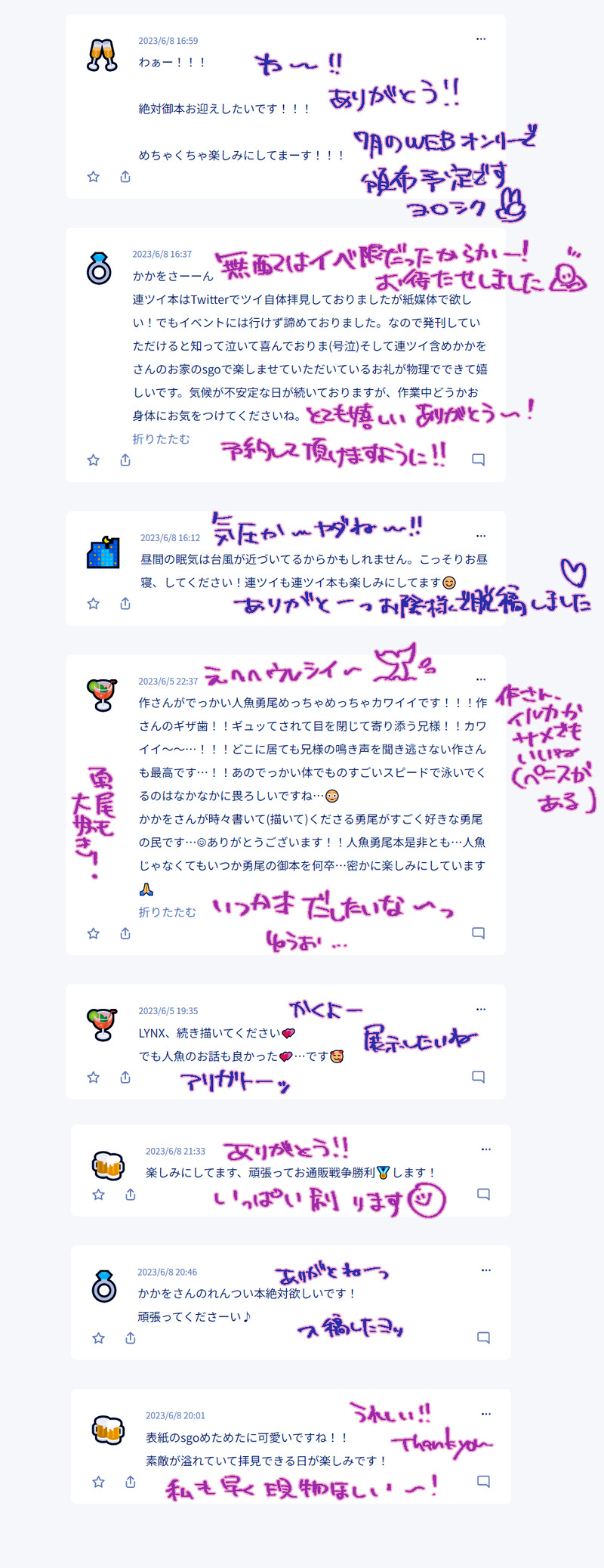 0gtaaan☆quiet followINFO🍻box返信です!いつもありがとう~!!おかげ様で連ツイ本脱稿しました✌ #乾杯返信 cheersReturnLetter Tap to full screen (size:935x2426).Repost is prohibited Let's send reactions! freqpopularsnackothersPayment processing Replies from the creator Follow creator you care about!☆quiet follow 0gtaaanINFO🍻box返信です!!ものすごくお待たせしました!!!!いつも本当にありがとうございます😊😊 0gtaaanINFO🍻box返信です!いつもありがとうございますそしていつも遅くて申し訳ない……! 0gtaaanINFO🍻box返信です!!いつもありがと~~う! 0gtaaanINFO🍻box返信です!!お待たせしました~!!誕生日のお祝いもありがとうございました🙇♂️🙇♂️ 0gtaaanINFO🍻box返信です!遅くなってすみません;;あたたかいコメントに生かされていました✊ 0gtaaanINFO🍻box返信です!こんな時間になってしまった!!!いつもありがとうございます😊 related works 0gtaaanINFO🍻box返信です!いつもありがとうございます!!ねん尾チャンのこともかわいがってくださって嬉しいです😊https://wavebox.me/wave/c1otdos9zkjm8811/ 0gtaaanINFOいつものなれなれしい乾杯返信です!SGOシチュ送ってくれてありがとうございます!!!いい薬です 2 0gtaaanINFO🍻box返信です!いっぱいメッセージありがとうございます😊LYNX好評でありがたい…! 2 0gtaaanINFO🍻box返信です~!!たいへんお待たせして申し訳ございません!!応援いただいたおかげ様で無事に本も出たしアンソロも発行できました😊ありがとうございます! 2 0gtaaanINFO🍻box返信です!いつもありがとうございます!!webオンリー中にも入れてくださってて嬉しかったです!あと連ツイ本のご感想もとっても嬉しい…ありがとうございました💜https://wavebox.me/wave/c1otdos9zkjm8811/ 0gtaaanINFO🍻box返信です!いつもありがとうございます!連ツイへの感想も新刊への感想もとても嬉しいです。https://wavebox.me/wave/c1otdos9zkjm8811/ 0gtaaanINFO🍻box返信です!いつもありがとう~!!おかげ様で連ツイ本脱稿しました✌ 0gtaaanINFO🍻box返信です!いつも本当にありがとうございます😭励みになりすぎるッッ 0gtaaanINFO🍻box返信です!遅くなった~~!!たくさんのメッセージありがとうございました!!原稿がんばります!!!
