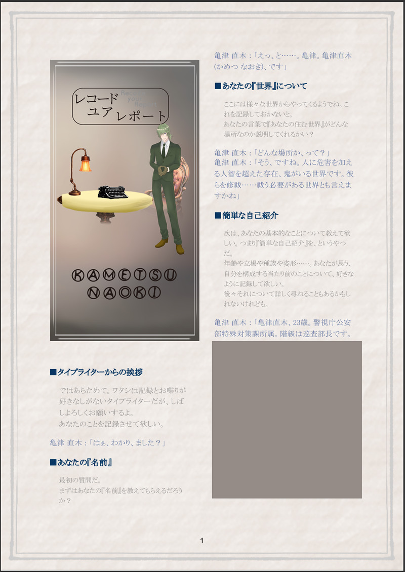 AYAjwmd☆quiet followMOURNINGGMレスTRPG/ソロジャーナル『レコードユアレポート』※2枚目からはイザナミの棺ネタバレあり🔑 イザナミHO1のHO名は?(漢字1文字) show hide show all(+6 images) Tap to full screen (size:969x1369).Repost is prohibited Let's send reactions! freqpopularsnackothersPayment processing Replies from the creator Follow creator you care about!☆quiet follow AYAjwmdMOURNINGGMレスTRPG/ソロジャーナル『レコードユアレポート』※2枚目からはイザナミの棺ネタバレあり🔑 イザナミHO1のHO名は?(漢字1文字) 7 AYAjwmdMEMO静永たち左:ラディアビの静永 勇巳(しずながいさみ)右:風雲児たちへの静永 良直(しずなが よしなお) 2 AYAjwmdDONECoC『誰がロックを殺すのか』HO1 ベース 弦谷 和重ディスプレイはシャチハタさんに作成いただきました!ありがとう!! 2 AYAjwmdDONEかいぶつたちとマホラカルト⏩️無辜なきかいぶつたちのカオスHO3『鬼』 轟木武彦 AYAjwmdDOODLEちみっこ🐢の結んでる髪の話嬉しいときはピコピコ動いてて悲しいときは内巻きになってそう AYAjwmdDOODLE🐢※イザナミの棺ネタバレあり 同卓⭕