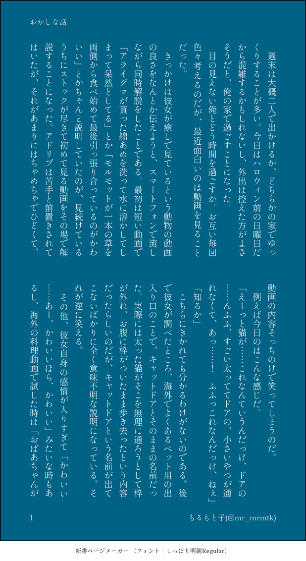 もるもと子☆quiet followMOURNING気に入ってなくはないけど一瞬Twitterでタグつけて投稿してやっぱ無理ってなってこっちで供養。全く洗練されていなければ甘くもない、ちょっと笑ってもらえればいいな程度のtn夢。多分「とにの日」の夢主ちゃんと同じ #金カ夢 aimingForTheGoldenHelix show all(+4 images) Tap to full screen (size:618x1132).Repost is prohibited Let's send reactions! freqpopularsnackothersPayment processing Replies from the creator Follow creator you care about!☆quiet follow もるもと子DONEぺろぺろ洪さん 4 もるもと子DONE執事ほんさんR18夢 4 もるもと子MEMOとにぬい旅行記3 9 もるもと子MEMOとにぬい旅行記2 5 もるもと子MEMOとにぬい旅行記 7 もるもと子DOODLE激遅ハロウィン漫画天使もるとデビもるが描きたかっただけやまもなければおちもない 3 related works Quavara_mandalaDOODLEラッコ鍋ノルマ(弊固定🏴☠️🫙) riffyunDOODLEもこもこルームウェア着た夢主とイチャつくsgmt⚠️夢主顔あり 3 まひるTRAININGogt夢絵?注意:某映画の模写。夢主の顔有り 氷輪(ひょうりん)DONE金カ夢tksm金カ夢文字書き24時間一本勝負で書いたものです。pixivで書いている「半券」シリーズの設定で書いてますので、少し分かりにくいところがあるかもしれません。あとほの暗いです。甘くもなんともないです。結局、月島軍曹はいご草ちゃんを忘れられないねって話です。彼岸花って北海道ではもともと咲かなかったらしいですね……。 1305 riffyunDOODLE以前載せてたsgmtと夢主でキスの練習 3 みんみDOODLE新人夢主(部長に一目惚れ)とやたら目が合うし何か言いたげな顔をするので悩み事でもあるのかと声をかけるも、まさか自分が原因とは知らない部長。(少しネタが降ってきたので夢イベントまでにショートマンガ描くつもり) 氷輪(ひょうりん)TRAINING140文字チャレンジ9月分書いたら増えていきますR18はありませんが、不穏や事後表現等ごちゃ混ぜです。何でも大丈夫な方のみどうぞお題はすべてこちらを使用しています140文字で書くSSお題https://shindanmaker.com/320966 28 氷輪(ひょうりん)DONEふたりで暮らす 卯月設定は夫婦でも同棲でもパスワード🔑は1+1=? 26 氷輪(ひょうりん)DONE金カ夢 kktイチゴ狩りに行く話こんなイチゴ狩りもいいですよねパスワード🔑は2+2=? 2111