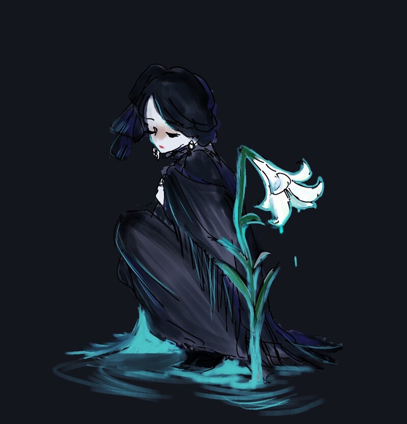 メアリさんの着てる羽織?のようなものから垂れてるたくさんの紐?がとても気になって、座るときれいに広がりそうだなぁと思ったところから。