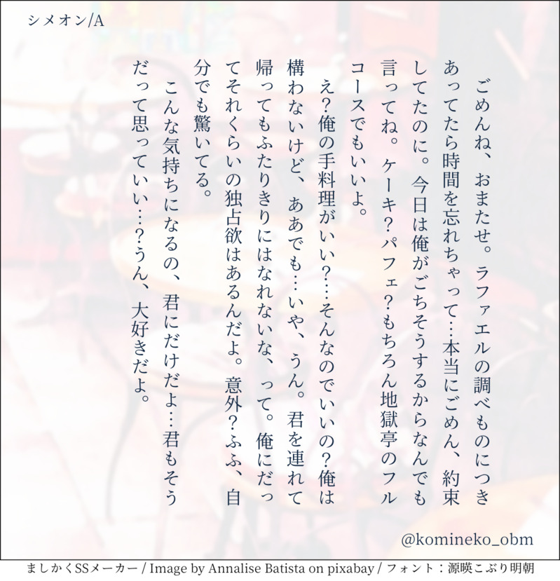 コミネコヒツジスキー☆quiet followDONE展示用シメオン。 show all(+1 images) Tap to full screen (size:1080x1120).Repost is prohibited Let's send reactions! freqpopularsnackothersPayment processing Replies from the creator Follow creator you care about!☆quiet follow コミネコヒツジスキーDONEカルシチネーム交換会!やった!できた!!できました!!!金田さんに頂いたネームになるほど仔犬小鳥にも色気があるなって思ったのに思ってたものにはなりませんでした笑。でも楽しかった!ありがとうございました!!!!! 3 コミネコヒツジスキーDONE悪魔兄弟とポッキーの日!去年(2021)のやつです! 7 コミネコヒツジスキーDONEバルバトス×MC。🔞ではないですけどそういう関係だよって話なので中学を卒業している方だけ読んでください!色っぽくはならなかった!! 2288 コミネコヒツジスキーDONE展示用ディアボロ。 2 コミネコヒツジスキーDONE展示用バルバトス。 2 コミネコヒツジスキーDONE展示用シメオン。 2 recommended works みたらし団子DOODLE練習 杉山@人ん家で朝食をDONEモブの下高校展示作品「右目をつぶして」ゲタ水前提のモブゲタ※明るくない 何でも許せる人向けですwebボックスこちら↓https://wavebox.me/wave/az8ayk0e24gxrsfh/ 18 heavy3690DOODLEアホエロ勢い 2662 BatoRannnn124DOODLEワルプルギス時代 idumiyaDONEいいSiri描けたから見て… POI11034968PROGRESS勝手な妄想で描いたジノマロですおそらく清書では内容少し変わると思います hisosei_04DOODLEいわひら自陣 曲パロとれす見たいところだけ描いたもの。曲/ Glue 様天狩冬凪⇨Pinky Night( https://youtu.be/ZCE7jFrTZ7M?si=blFRGW94Z_uBi7ig )待雪想⇨シイクレット・フィル( https://youtu.be/VsNPOH0WOLE?si=3axlpAFnhOxuzjvm )pass→シナリオ名 平仮名 7 chaos_kan_trpgDONEMVZEの新フライヤーです cheshiskyDONECoC『AI.Heart』作:あお 様KPC/KP╘ 柳 夏紅夜/かんぱりPC/PL╘ 藤戸 凪咲/ちぇし観戦-Imataki,きゅーす🫖<敬称略>END:A <両生還> 2